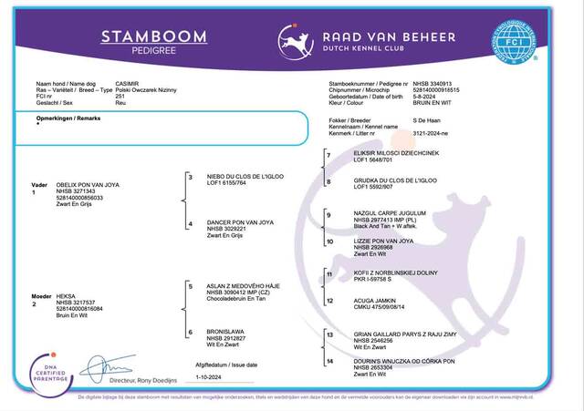 Moby is een nakomeling van Saartje (Maggi Pon van Joya) en Olli (Czabor Futrzak Podlaski). Met zijn komst naar onze kennel zet hij de mooie bloedlijn door van zijn vader OLLI die we uit Polen hebben geimporteerd. Helaas is zijn vader inmiddels overleden dus zijn we extra blij dat Moby onze kennel komt versterken. Daarnaast is hij ook RCD-4 normaal.