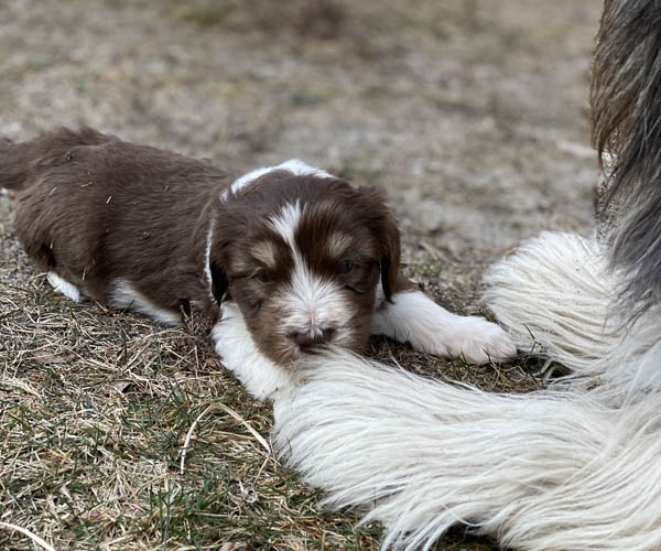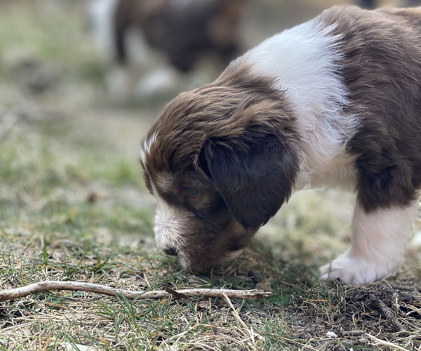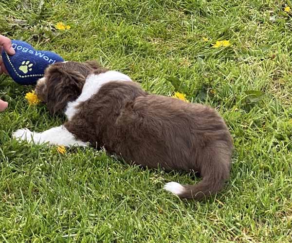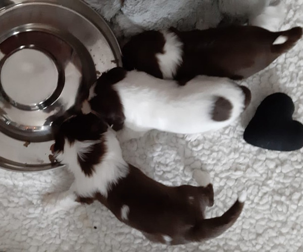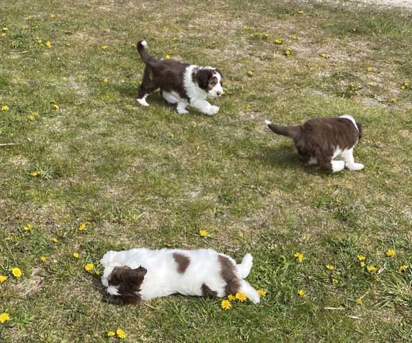 Maandag 12 april: Wat genieten de puppen en mama Dido! Wij dus ook...... De puppen zijn nu al net echte hondjes. Ze dartelen met elkaar en spelen volop met elkaar. Ze krijgen nu een paar keer per dag wat vers vlees waarvan een keer per dag uit een trog ipv uit hun eigen bakje zodat ze goed leren om te delen en bovendien ook een beetje ''happeriger'' worden op hun voer zodat ze goed voergericht worden wat weer handig is als je met ze gaat trainen.