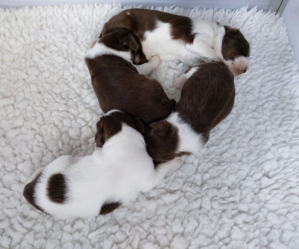Zondag 21 maart: De puppen groeien goed! De eerste dagen was Dido niet bij haar puppen weg te krijgen maar nu gaat Dido steeds vaker even uit de werpkist en komt dan weer terug in de werpkist als de puppen gevoed willen worden. Zo mooi hoe ze dat precies weten te timen.
