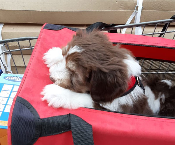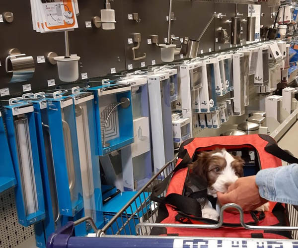 Woensdag 5 mei: Gaan we puppen mee naar de bouwmarkt waar ze hun kleine oogjes uitkijken. Ze blijven rustig want ze zijn inmiddels al zoveel gewend. Super goed voor ze al deze nieuwe indrukken!