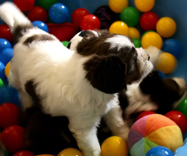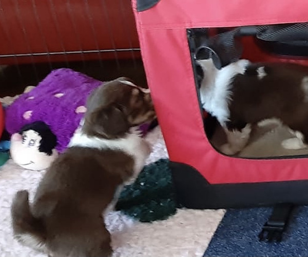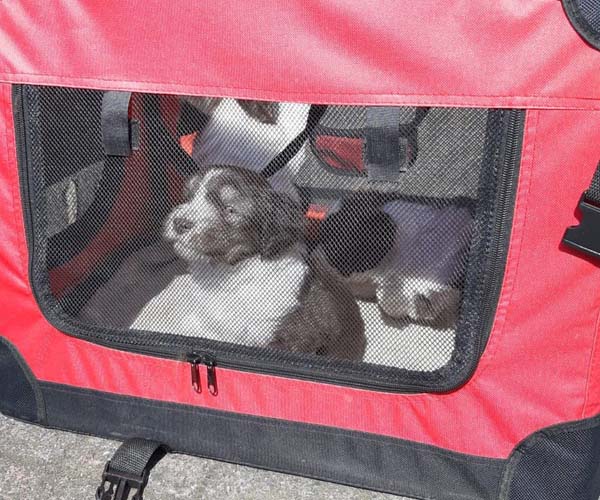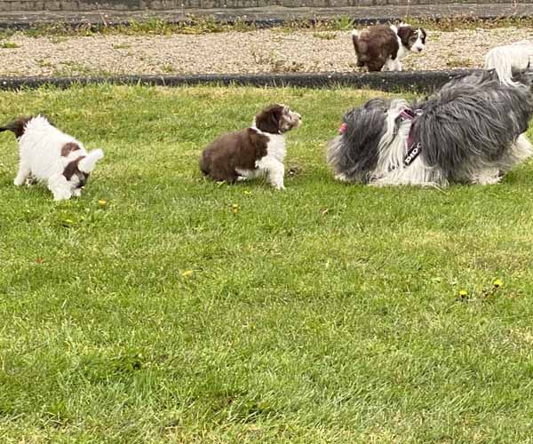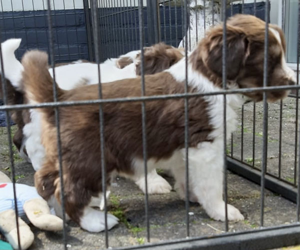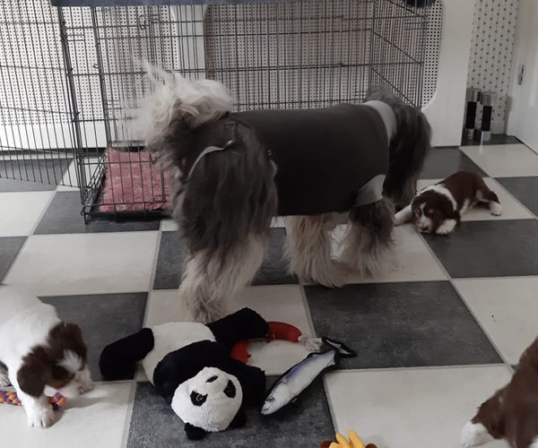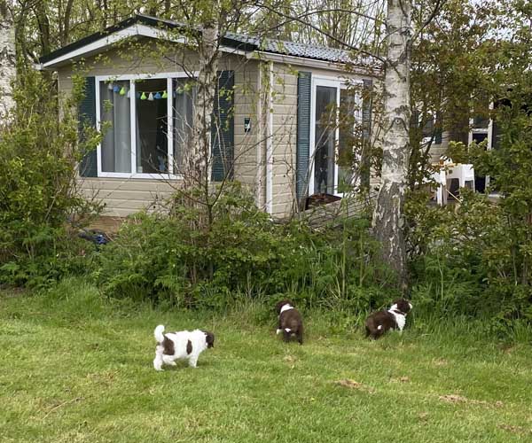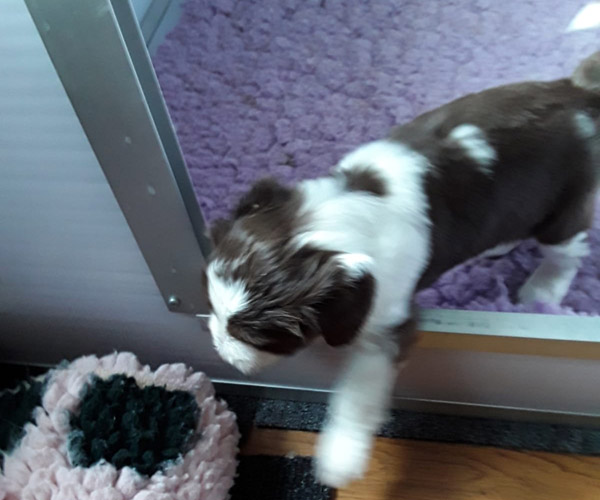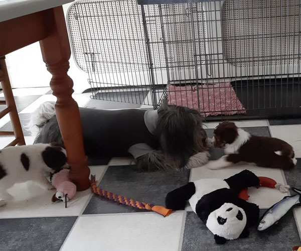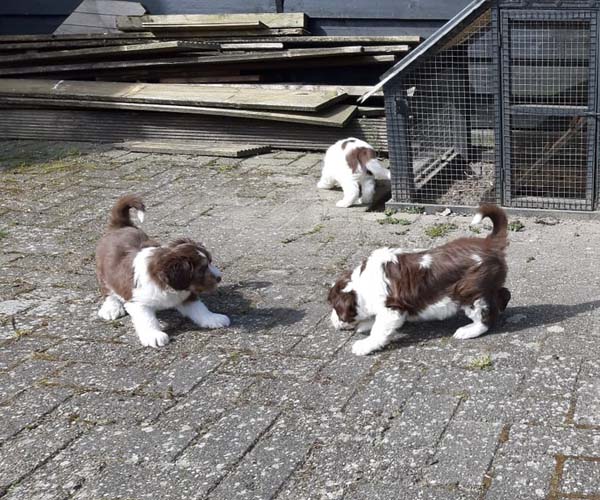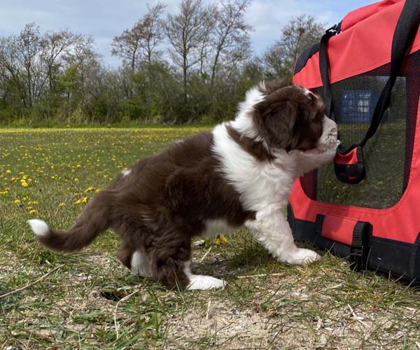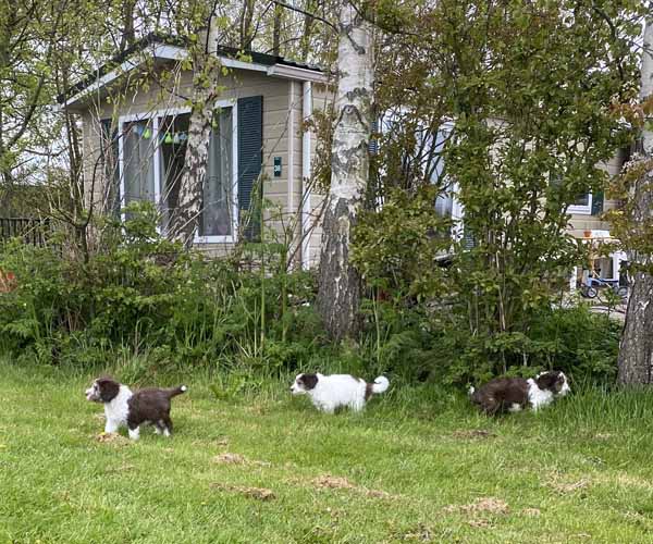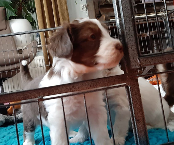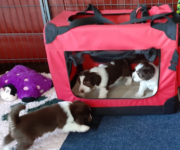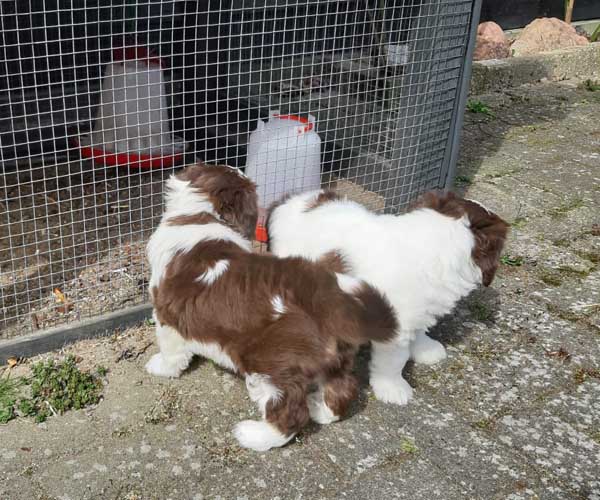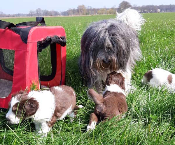 Donderdag 15 april: De puppen krijgen uiteraard ook benchtraining. Eerst op speelse wijze in de puppyren en dan langzaam aan doen we ook het deurtje zo af en toe eens dicht met meerdere puppen gelijktijdig in de bench en zo wennen we ze langzaam aan alleen in de bench en in verschillende soorten benches. Wel zo fijn voor als ze straks naar hun nieuwe gezin gaan dat ze al zo goed gewend zijn aan de bench.