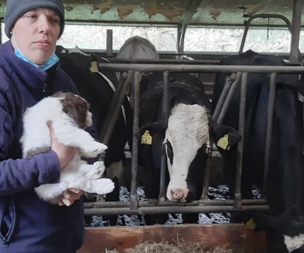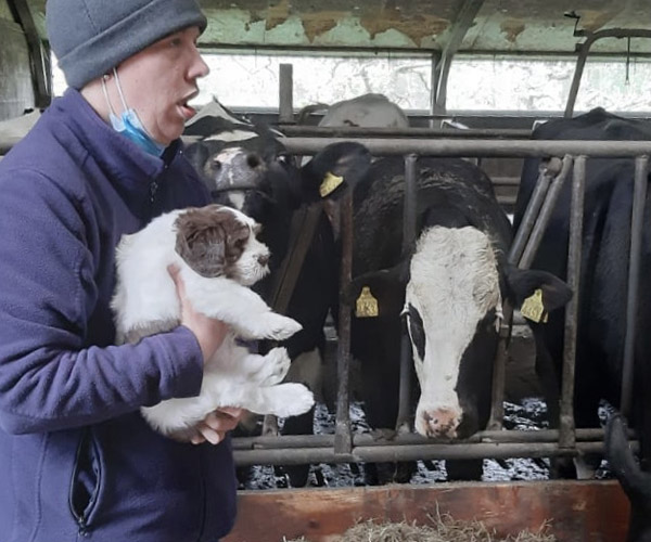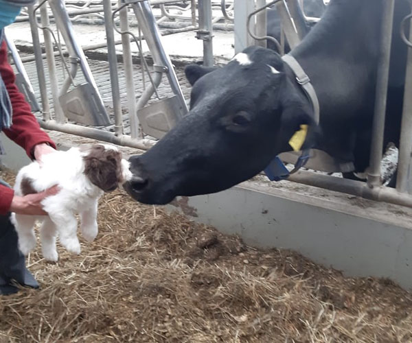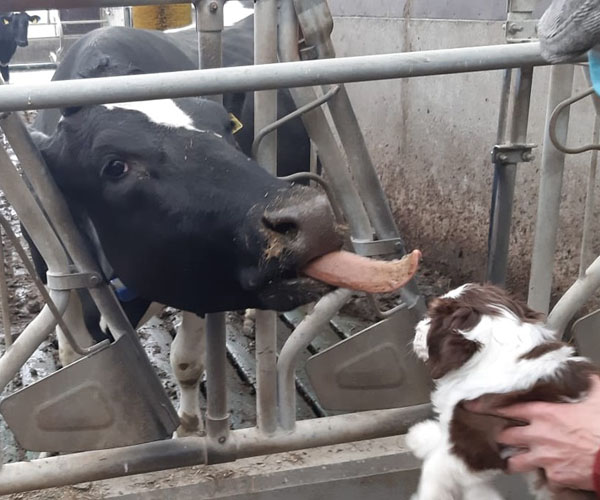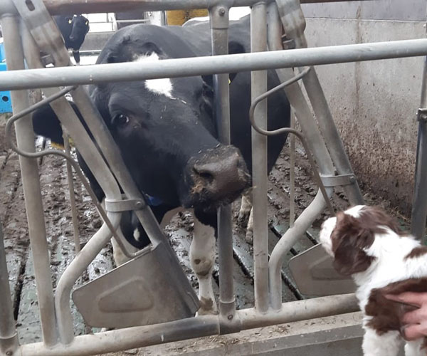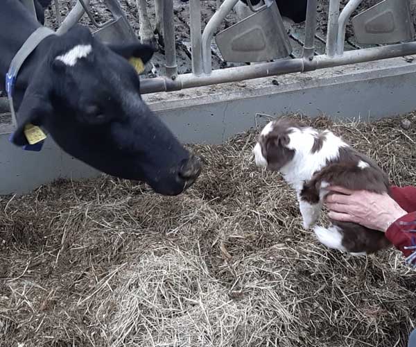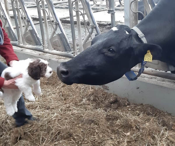 Vrijdag 30 april: is het tijd voor een bezoekje aan de boerderij. De puppen ruiken veel nieuwe geuren en ze vinden het eigenlijk helemaal prima bij de koeien!