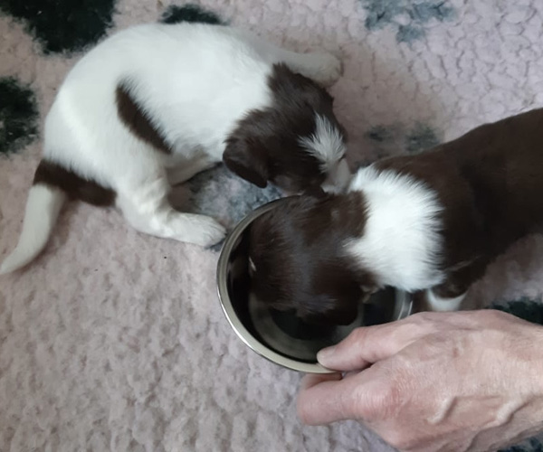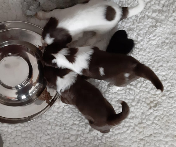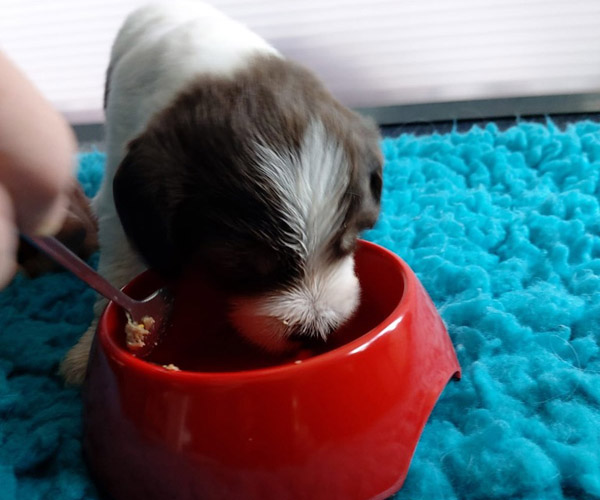 Dinsdag 6 april: Vandaag krijgen de puppen een eerste hapje vers vlees. We beginnen daar heel erg langzaam mee en dat houdt in eerst 3 dagen lang slechts een half theelepeltje.... dan kunnen hun maagjes langzaam wennen aan vast voedsel. Ze moesten even wennen maar likten daarna wel hun bekjes af. Dido vond het helemaal niet erg om ze te helpen!