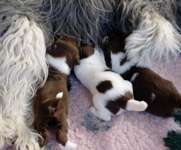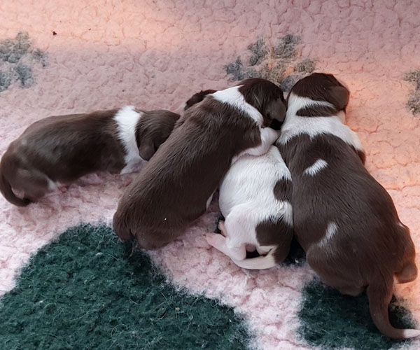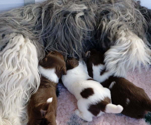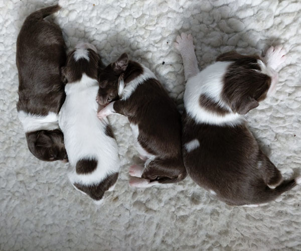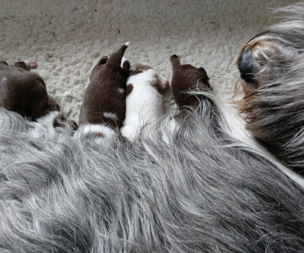 Vrijdag 12 maart: We vieren feest want Dido en Rumi hebben vandaag 4 prachtige donkerbruine puppen op de wereld gezet! We hadden wel gehoopt op de kleur bruin maar niet verwacht. En om dan 4 keer zo'n mooie diepbruine kleur bruin te krijgen was bij iedere pup die geboren werd weer een hele lange AAAAAAAAAHHHHHH wat prachtig!