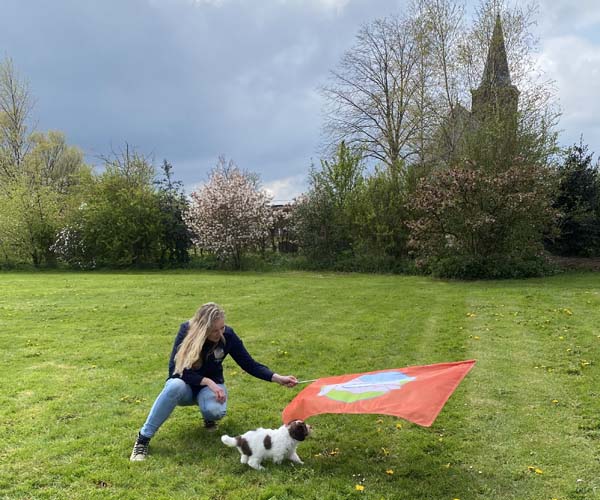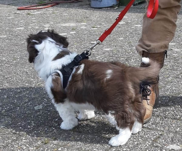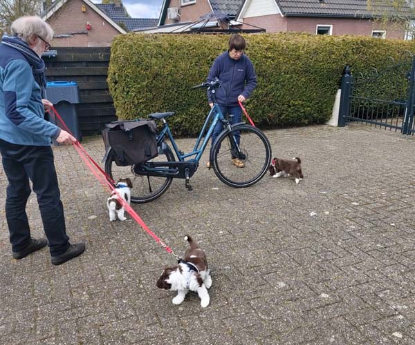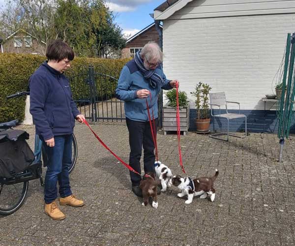 Zondag 2 mei: De puppen leren wennen aan het dragen van een zacht tuigje en het lopen aan een lijntje. Eigenlijk doen ze het al best goed!