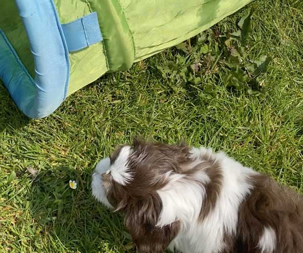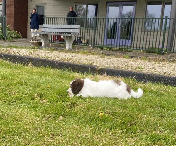 Vrijdag 16 april: het is vandaag echt heerlijk weer en de puppen mogen vandaag voor het eerst lekker buiten genieten. Ze vinden alles prachtig. Ook een mooie gelegenheid om buiten te trainen met de bench zodat de puppen zondag mee kunnen voor hun eerste uitstapje met de auto.