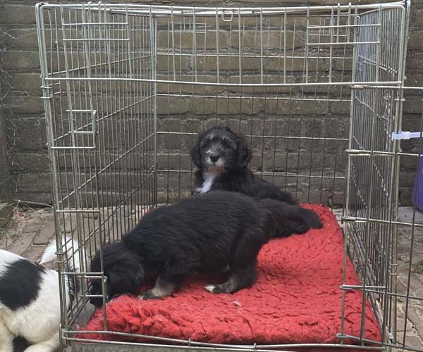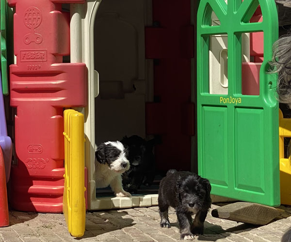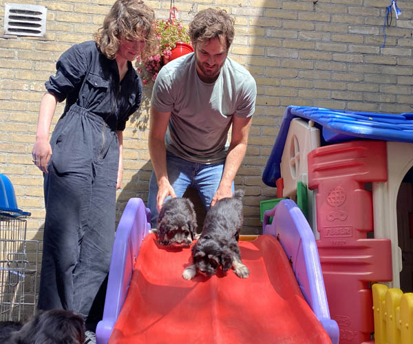 Ze hebben in hun eigen puppyren inmiddels ook een schommel en een draadbench waar ze zich heerlijk veilig in voelen. Natuurlijk is hulpmama Nanu weer helemaal in haar element en de puppen vinden haar geweldig!