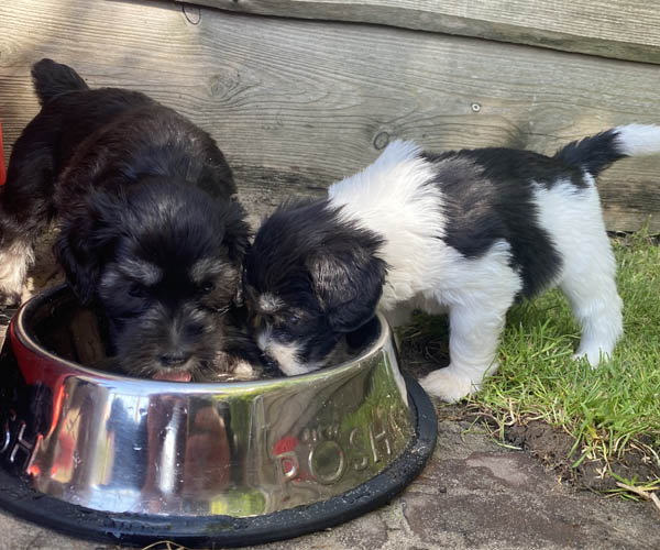 2 Mei: Och och wat gaat het snel! Mama Puk gaat steeds vaker staande voeden. En arme Puk want de puppen hebben inmiddels vlijmscherpe hoektanejes zoals je op een van de foto's kunt zien! We geven ze nu ook eenmaal daags eten uit een trog in plaats van iedere pup een eigen bakje. We willen namelijk graag dat de puppen voergericht zijn als we straks met ze gaan ''trainen''. Het is heel fijn als een hond graag voor je werkt met als beloning een lekker hondenkoekje. Dat maakt trainen leuk voor hond en trainer. Verder wennen we ze ook alvast aan het dragen van een tuigje zo nu en dan. Heerlijk als ze straks het nest verlaten en het is allemaal al vertrouwd.