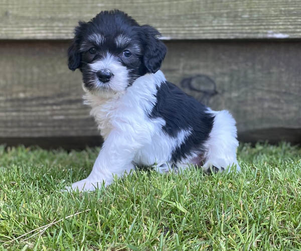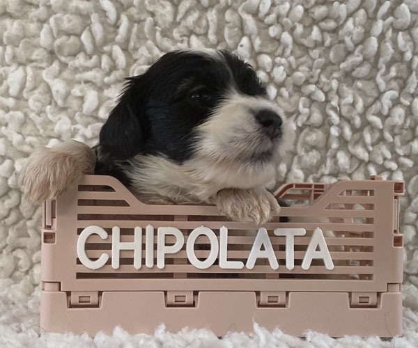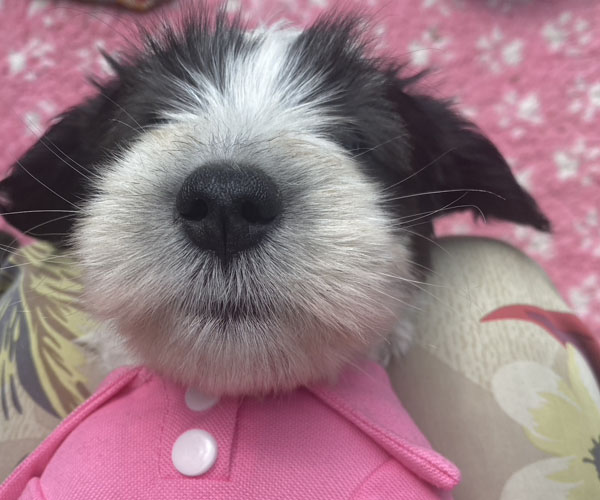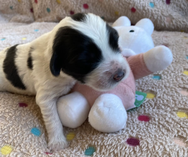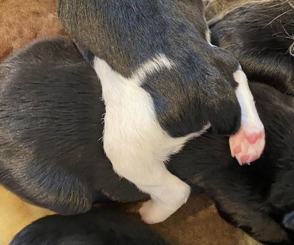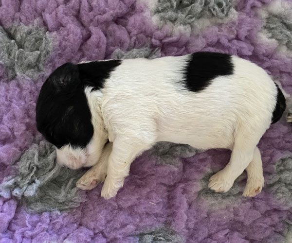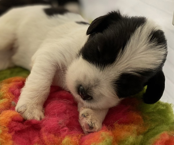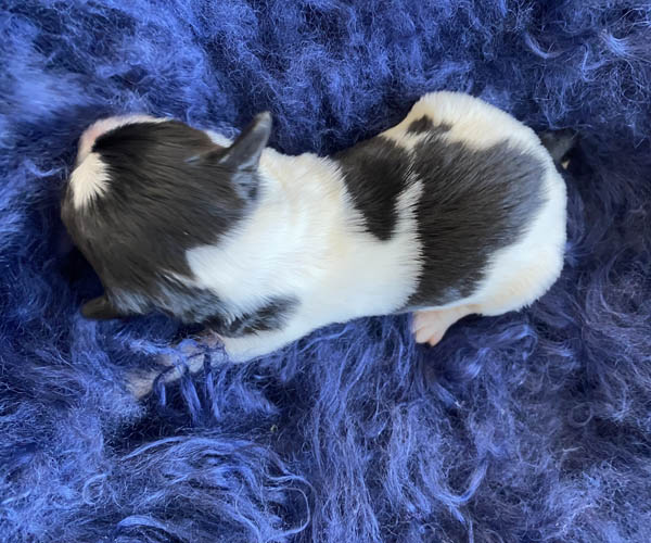 Pup 9 CHIPOLATA Teefje wit/zwart met een korte staart. Geboortegewicht 288 gram.