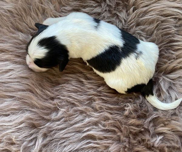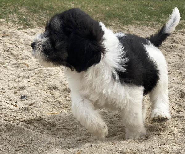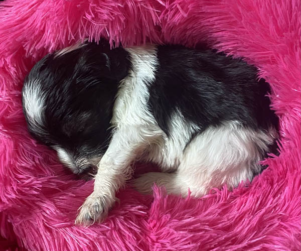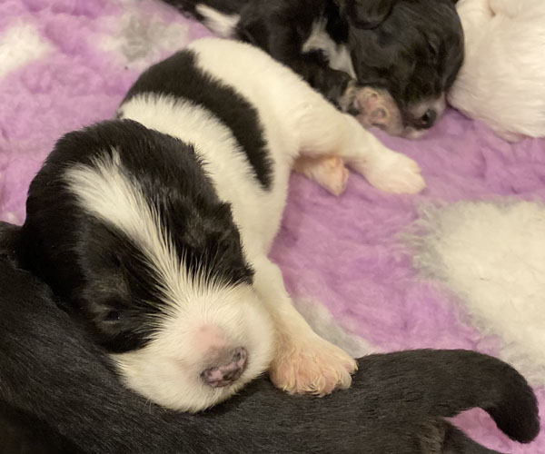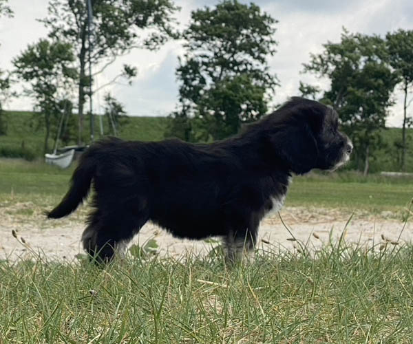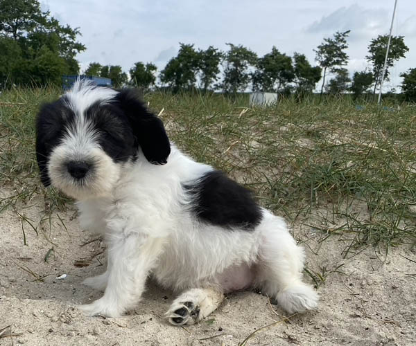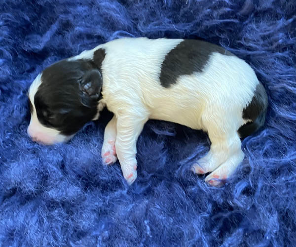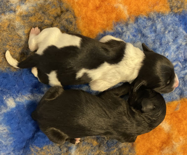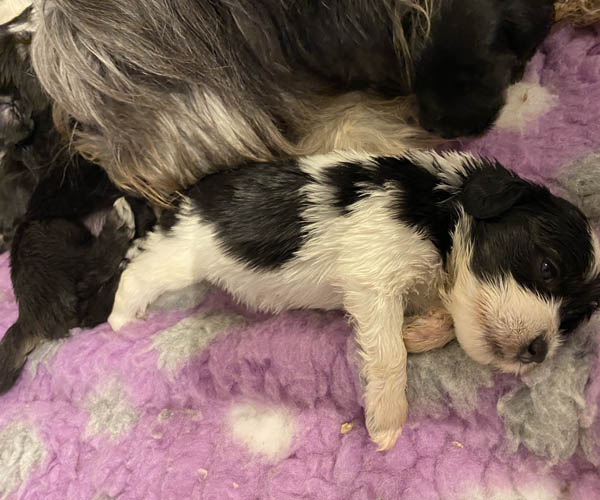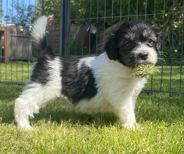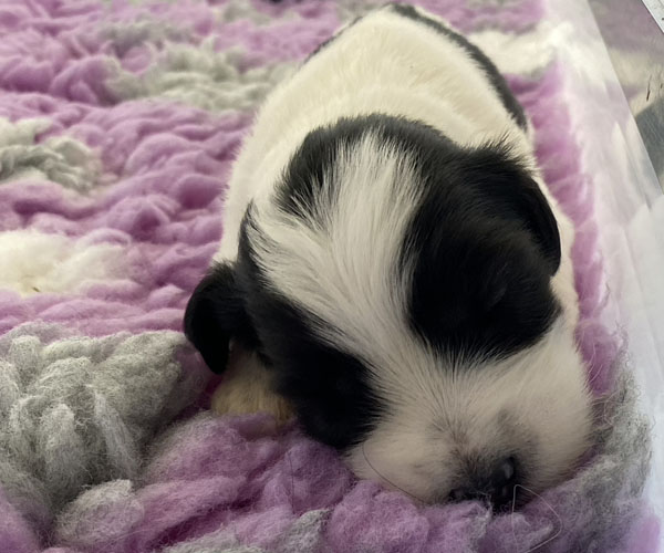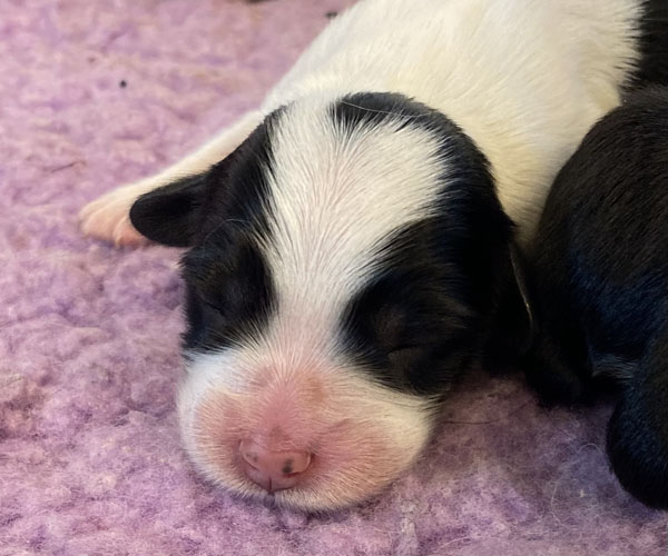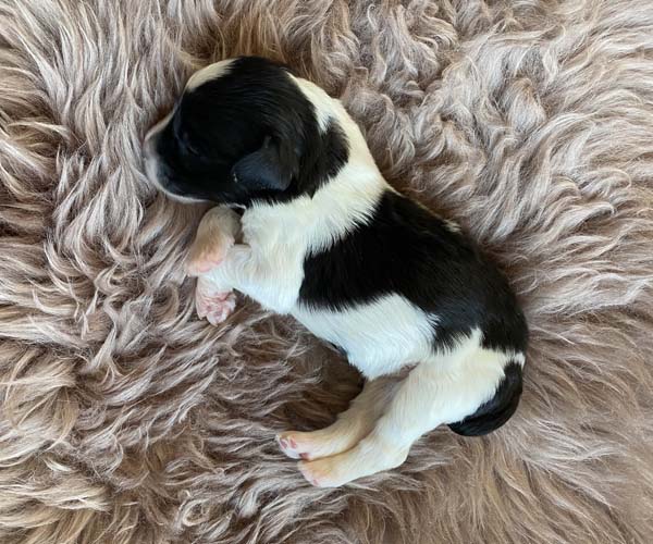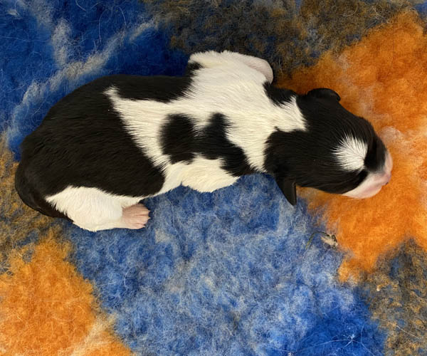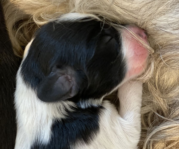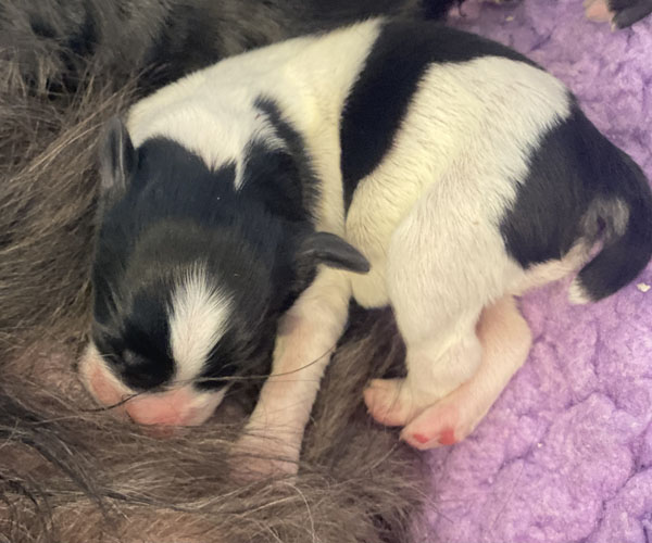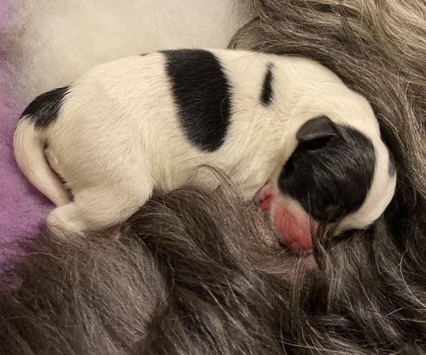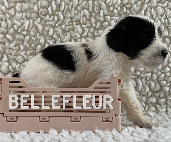 Pup 1 BELLEFLEUR Teefje zwart/wit met een lange staart. Geboortegewicht 300 gram