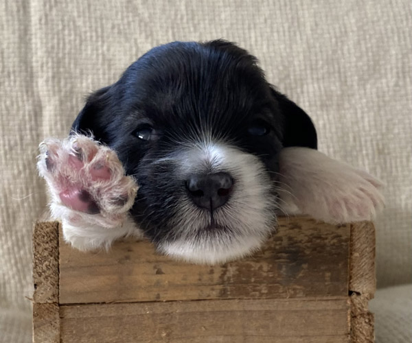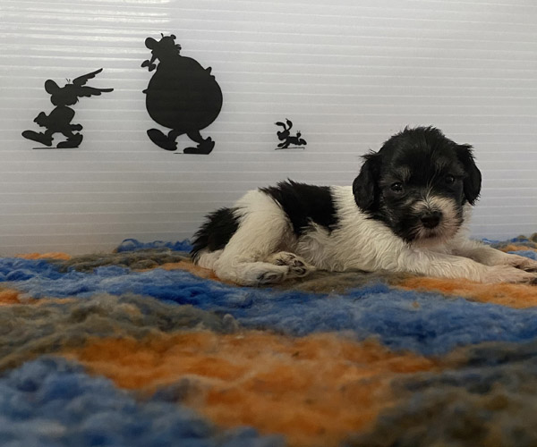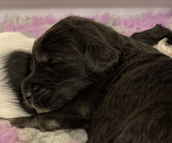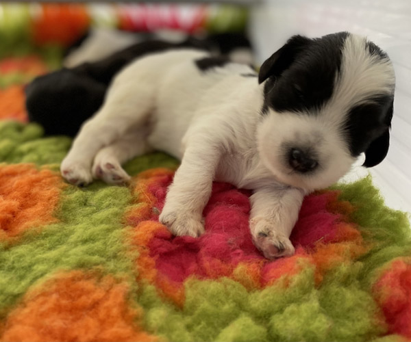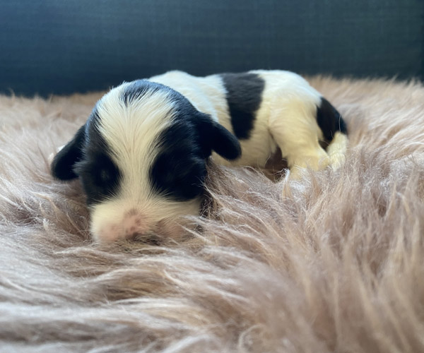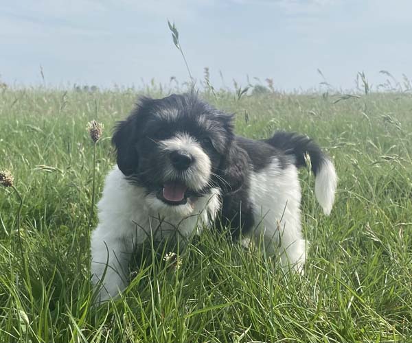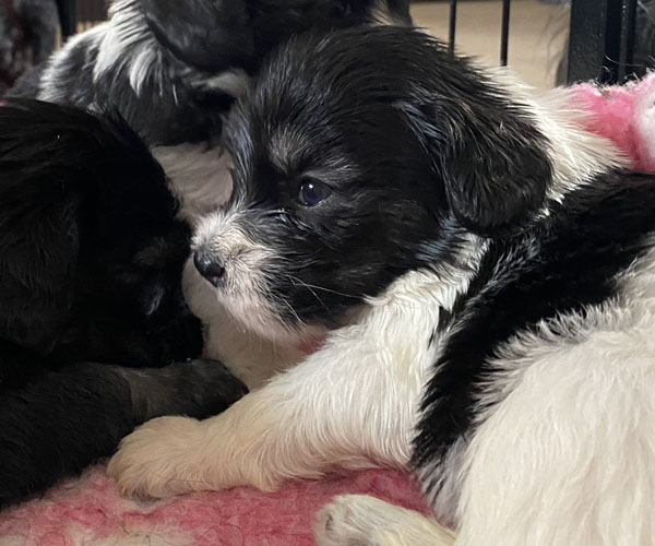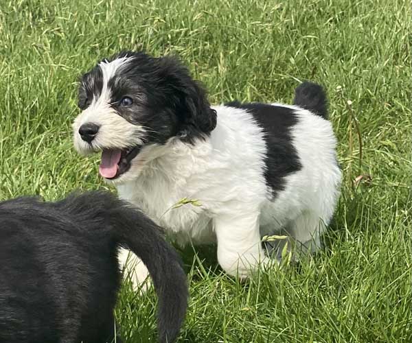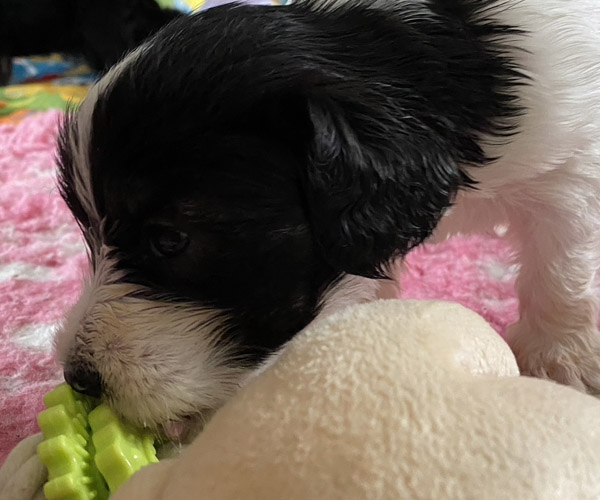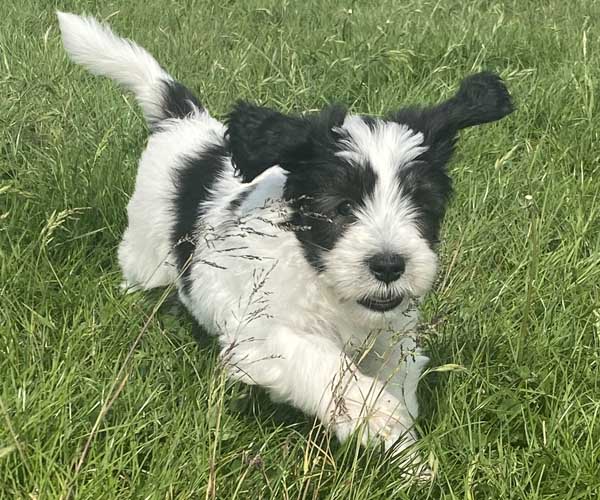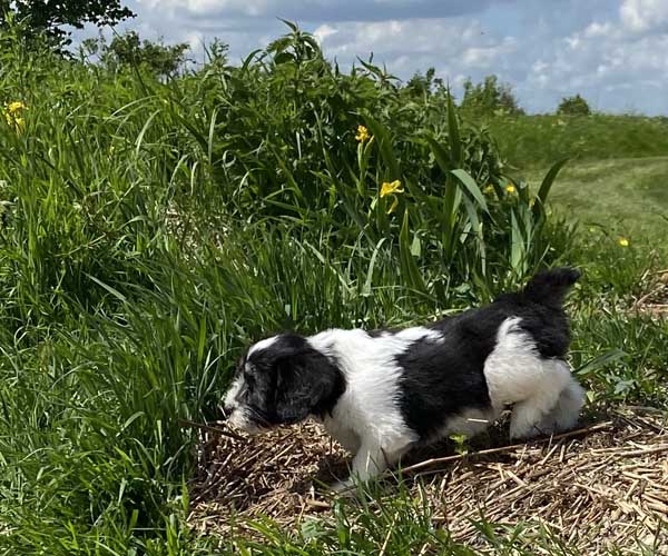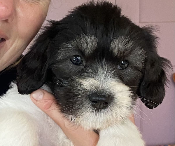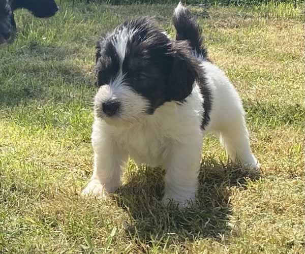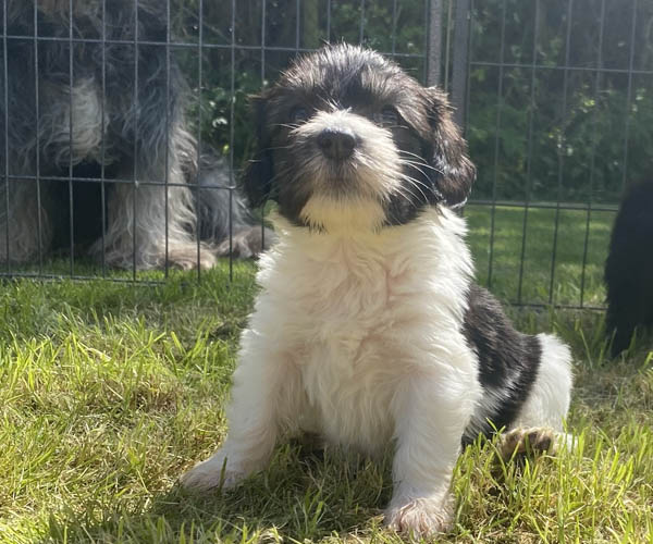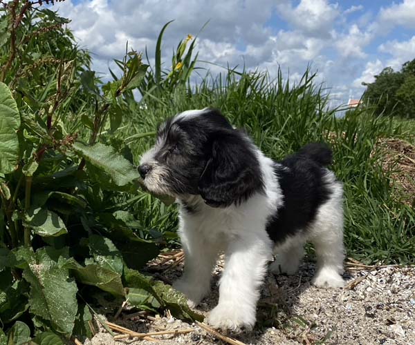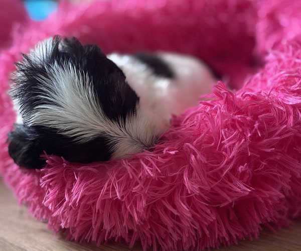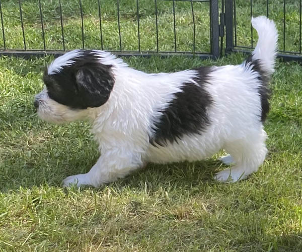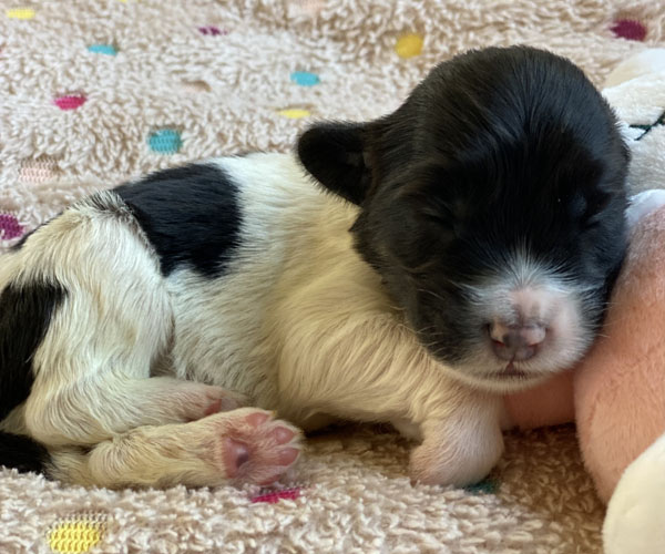 Pup 1 BELLEFLEUR Teefje zwart/wit met een lange staart. Geboortegewicht 300 gram