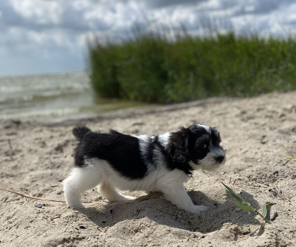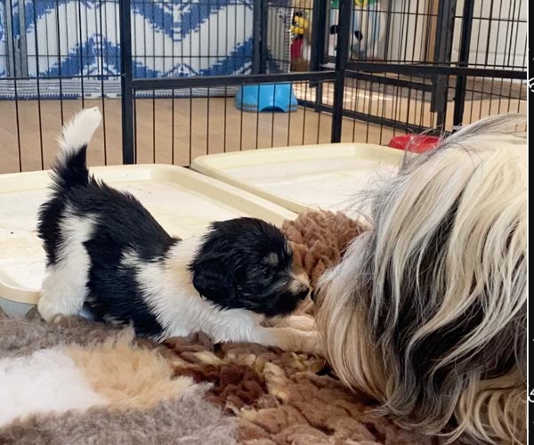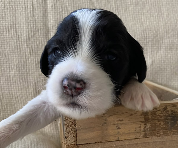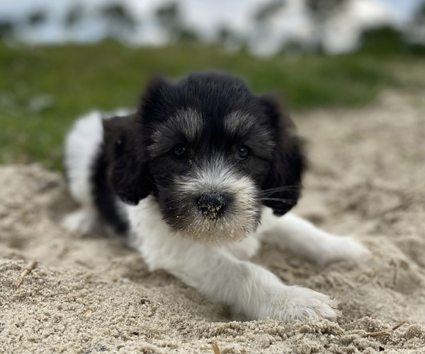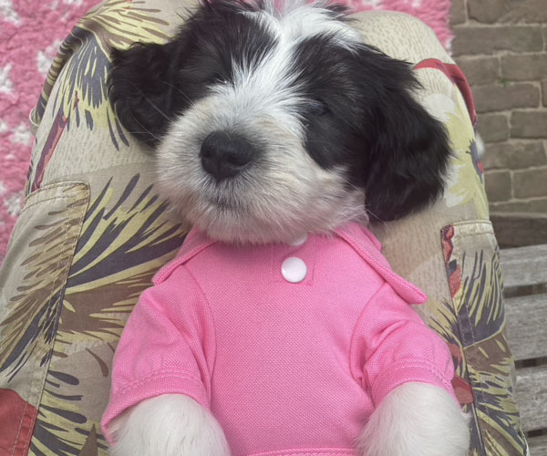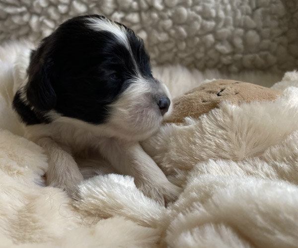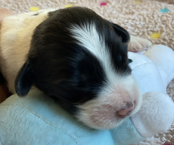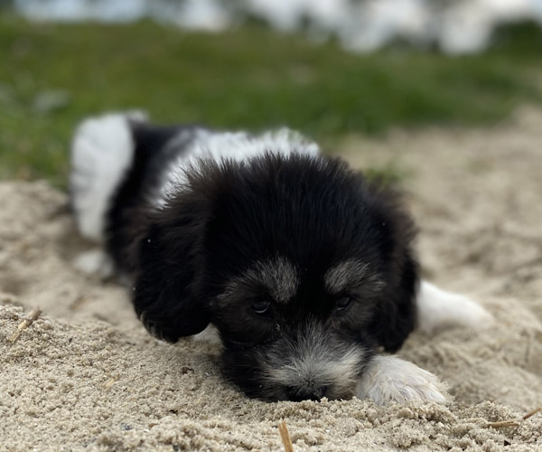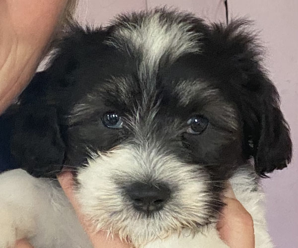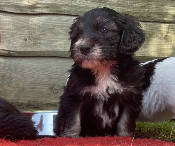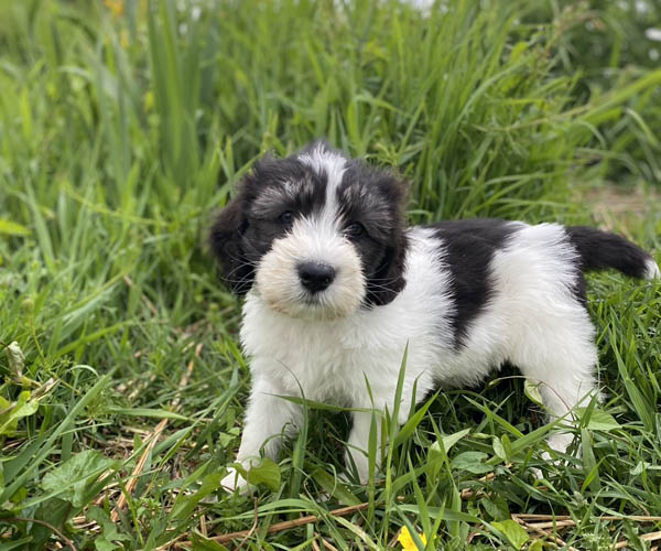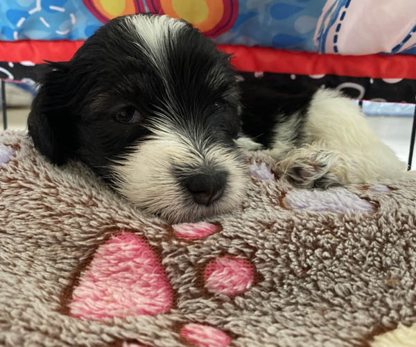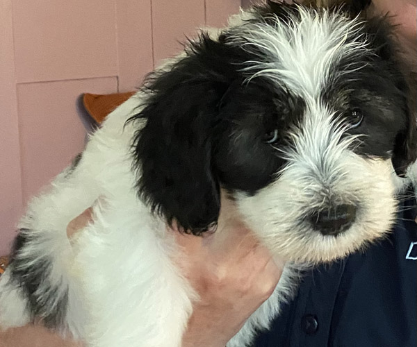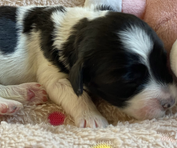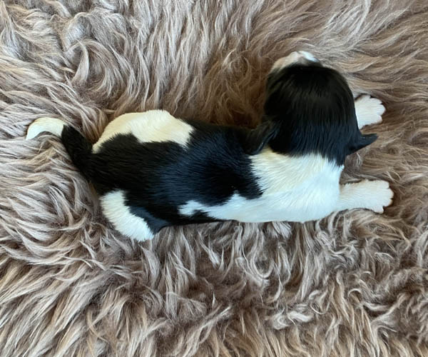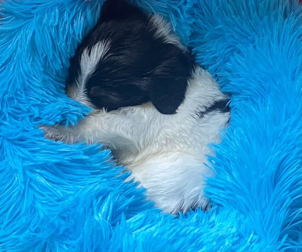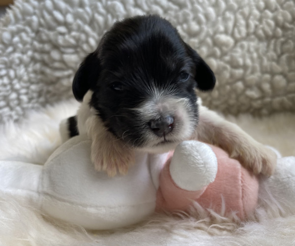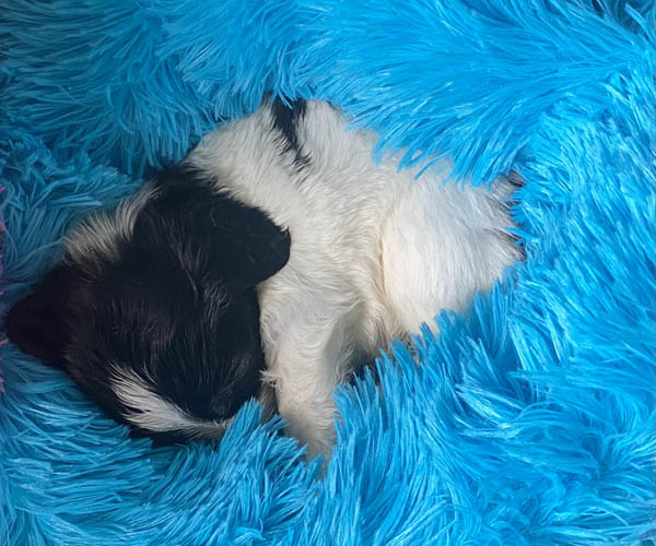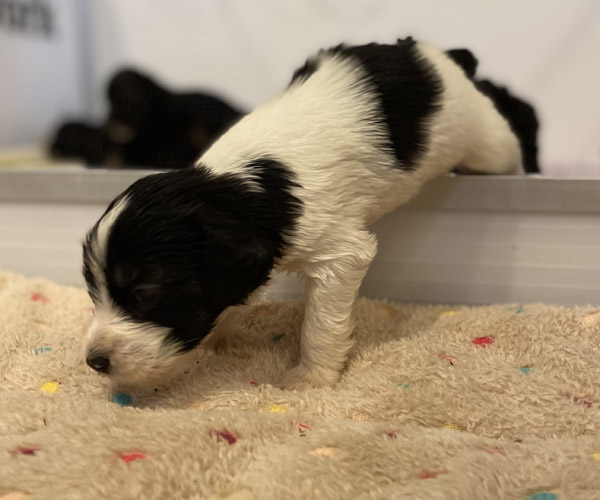 Pup 1 BELLEFLEUR Teefje zwart/wit met een lange staart. Geboortegewicht 300 gram