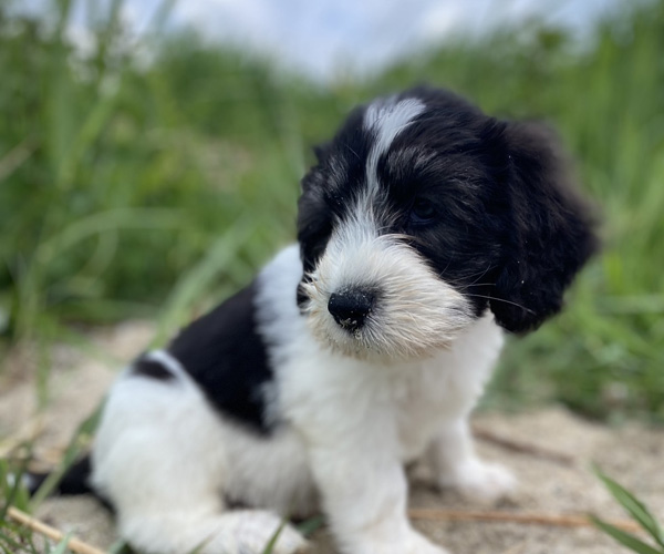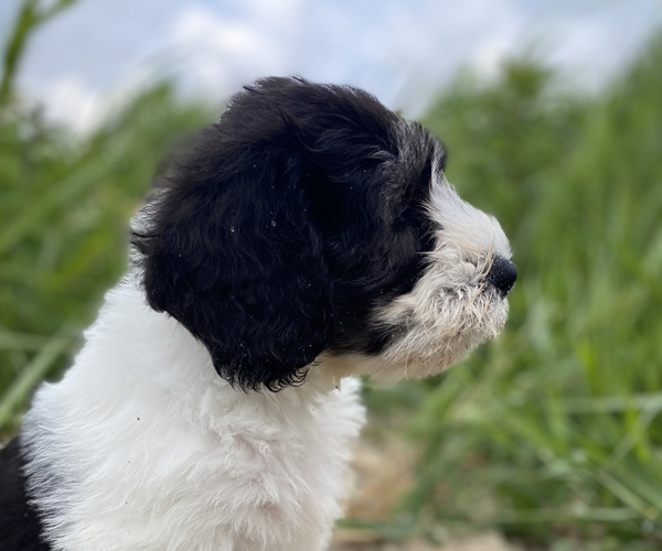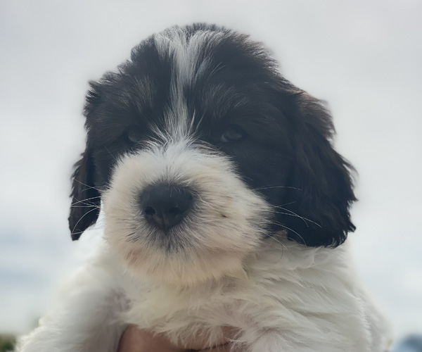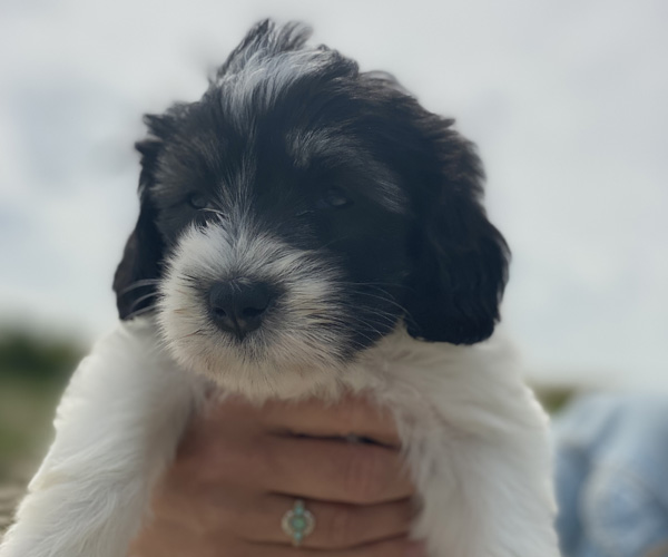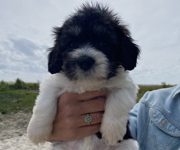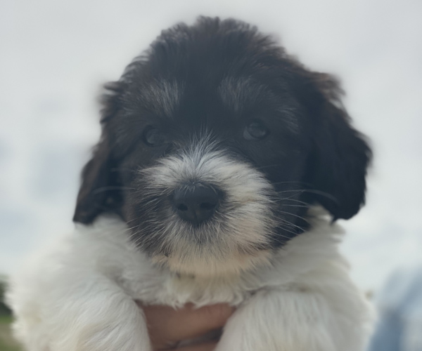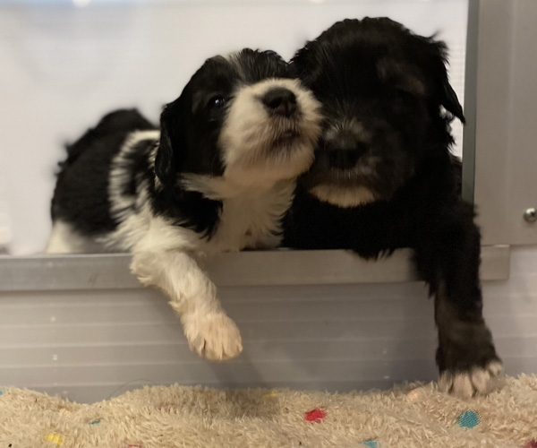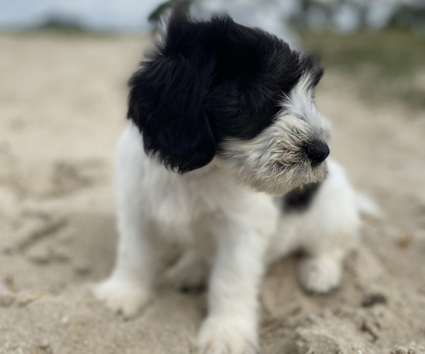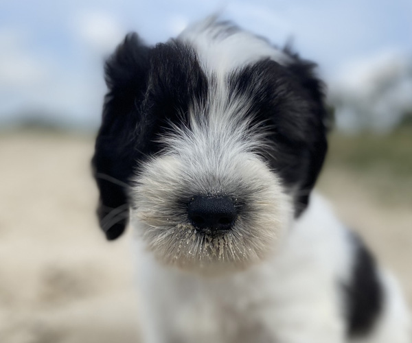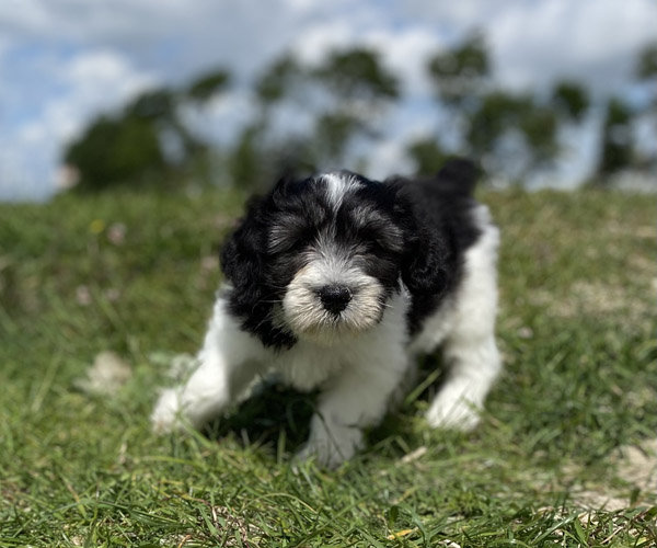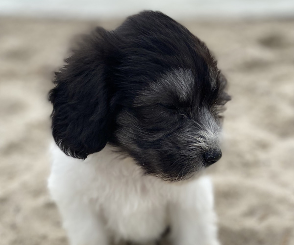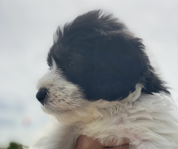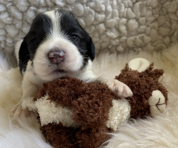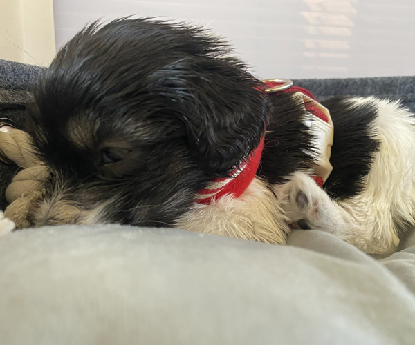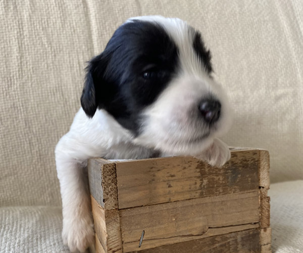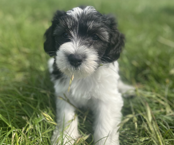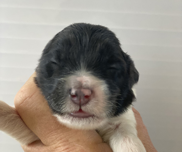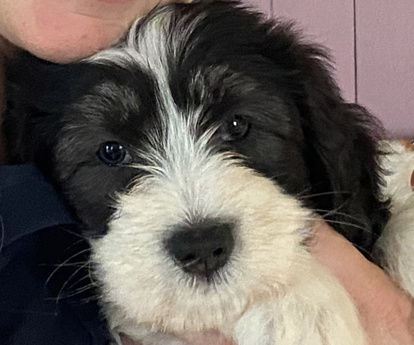Pup 1 BELLEFLEUR Teefje zwart/wit met een lange staart. Geboortegewicht 300 gram