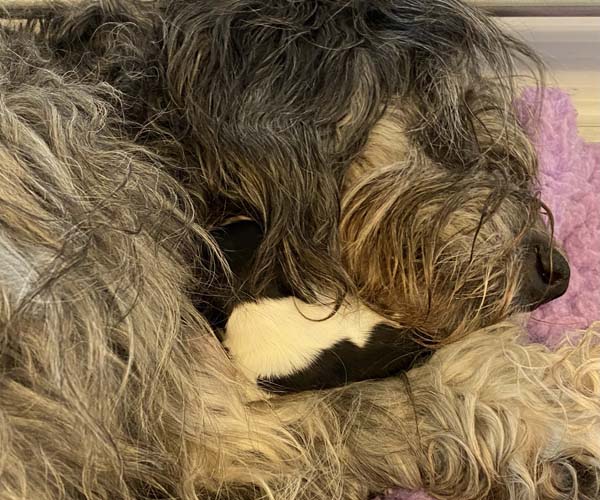 Puk lijkt te beseffen dat deze pup niet leeft en besteed al haar aandacht aan haar 10 puppen.