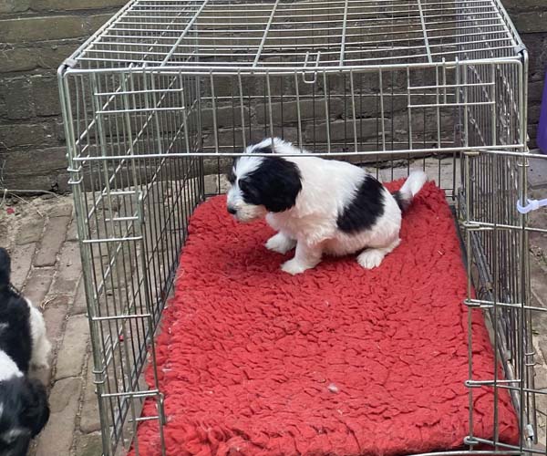 We zijn ook begonnen aan de benchtraining door een paar canvasbenches in de puppyren neer te zetten en de puppen te motiveren de benches te verkennen. We zullen de puppen met allerlei verschillende soorten en maten benches kennis laten maken zodat zij straks als ze naar hun nieuwe huisjes gaan de bench goed kennen. Dat scheelt weer veel werk straks.