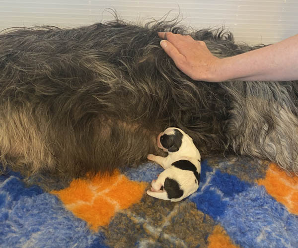 De eerste persweeen kondigen zich aan en het duurt niet lang of de eerste pup is geboren. Het is zondagmiddag 12.45 uur. Een klein uurtje later komt ook de tweede pup (prachtig in het vlies)