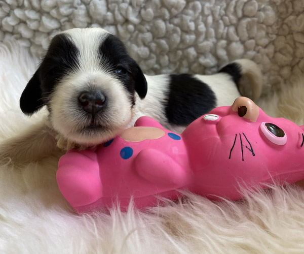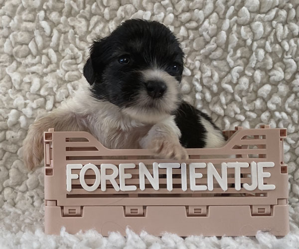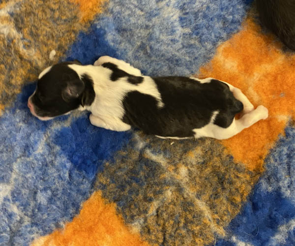 Pup 8 FORENTIENTJE Teefje wit/zwart met een lange staart. Geboortegewicht 284 gram.