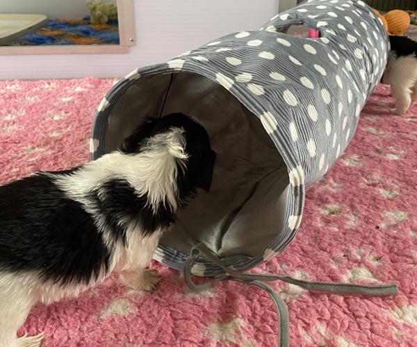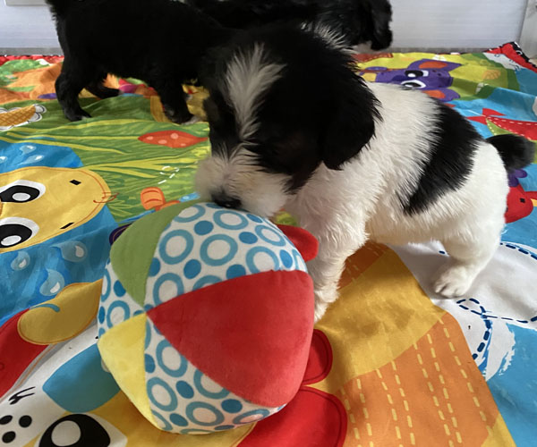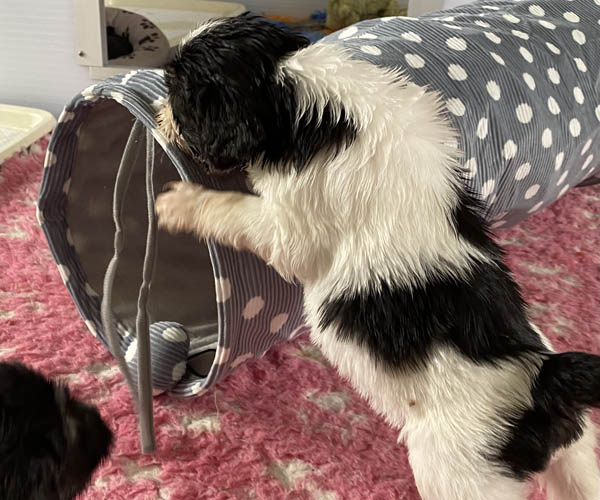 De puppeduppen krijgen iedere dag ander speelgoed aangeboden. Zo blijft het steeds opnieuw ontdekken hoe jong ze ook zijn...... Zoveel mogelijk nieuwe uitdagingen op hun eigen niveau. We hebben maar zo kort de tijd met ze en in die 8 weken willen we ze alles bieden wat we maar kunnen om de puppen zo stabiel mogelijk naar hun nieuwe mandjes te laten gaan.