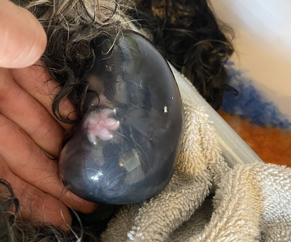 Het lijkt enorm triest want deze pup is ook helemaal slap en wit en blauw. Er zit geen leven in.