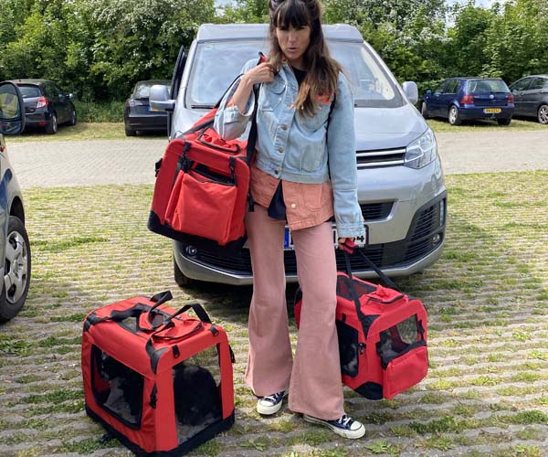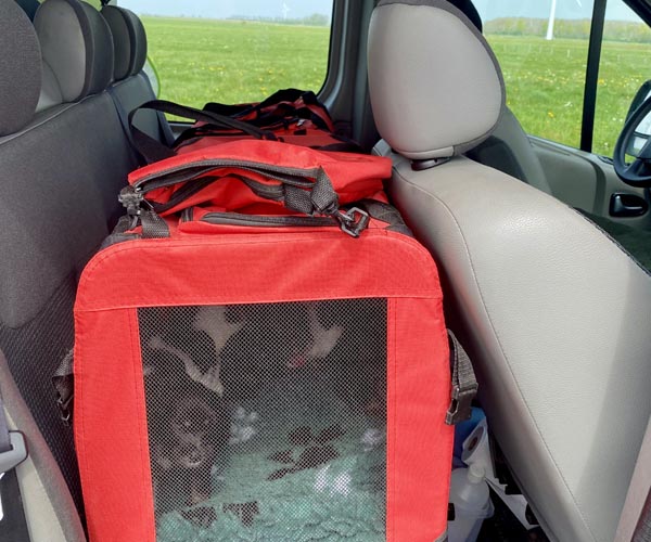5 mei en de puppen zijn 4 en een halve week. Dat betekend bij ons hun eerste autoritje. Eerst hebben ze aan de canvas benches mogen wennen veilig in hun eigen puppyren en vandaag een kort ritje in de auto in deze benches. Als je de puppen jong genoeg went aan de auto en veilig met elkaar dan hebben ze daar straks profijt van.