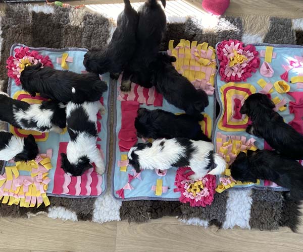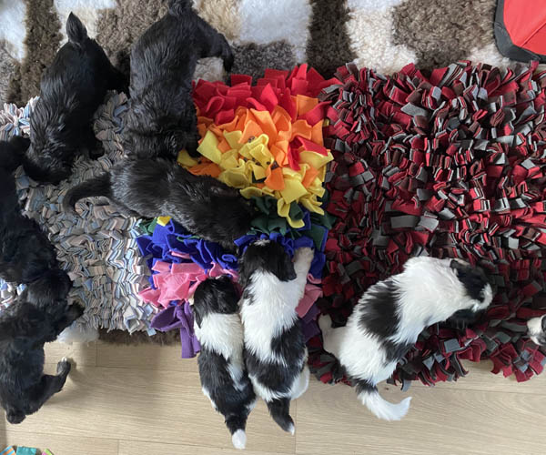 Ook hebben ze voor de eerste keer farmfood puppybrokjes gekregen in snuffelmatjes. Normaalgesproken hebben we een snuffelmat maar voor 11 puppen vraagt het om wel 3 snuffelmatjes naast elkaar :)