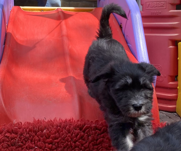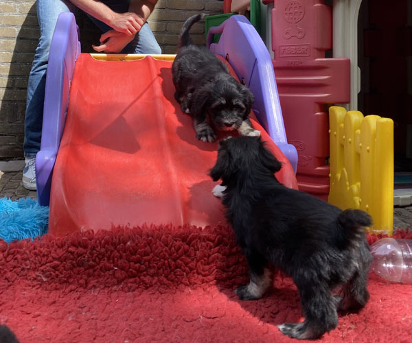 Dinsdag 24 mei en de tijd breekt aan dat we afscheid van dit geweldige nest moeten gaan nemen. Dat is niet leuk voor ons maar wel voor de puppen en hun toekomstige baasjes. We beseffen ons terdege dat wij ze niet meer kunnen bieden wat ze nodig hebben en dat het tijd wordt voor de puppen om individuele aandacht te gaan krijgen. We genieten nog een paar laatste dagen volop met en van ze en ze krijgen nog volop aandacht en visite. We kunnen ze nog even shock-proof maken en dat doen we door middel van onze glijbaan! Gelukkig hebben we volop hulp.