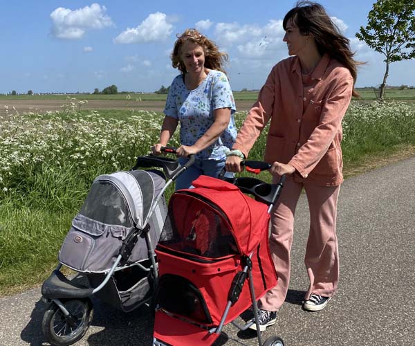 Ze zijn meegeweest naar het strand, meegeweest op een terrasje.... ha ha, jeetje wat vervelend dat we de puppen daaraan moeten laten wennen :) ze hebben bijna dagelijks visite en ze zijn meegeweest in de buggy en veel mee in de auto en ze zijn zelfs meegeweest naar de boer om kennis te maken met de koeien en met kittens! Waar we ook komen worden we achtervolgd door mensen die de puppen willen knuffellen en dat is uiteraard erg leuk. We zijn er wel erg druk mee hoor! Gelukkig heb ik hulp gekregen van mijn dochter.