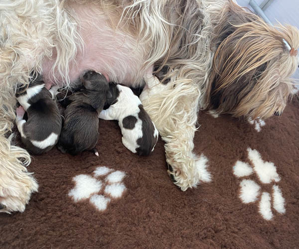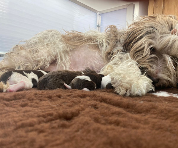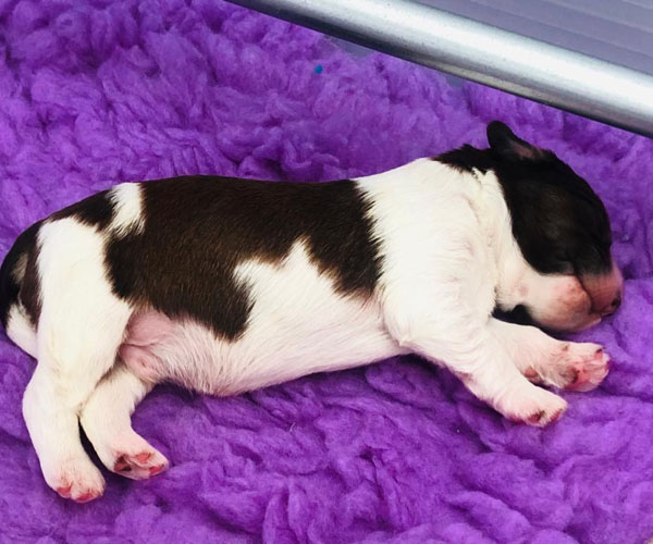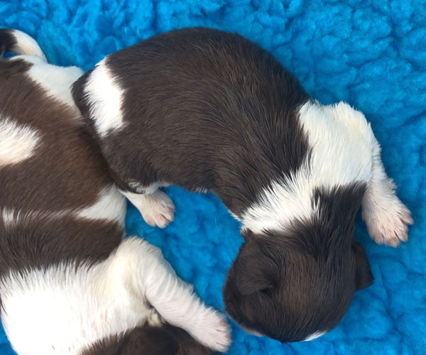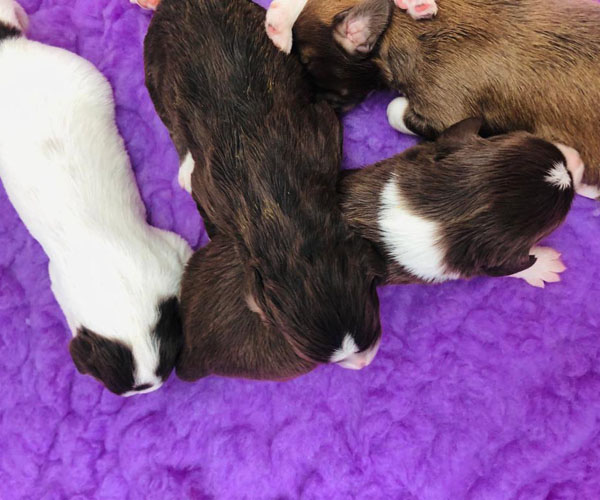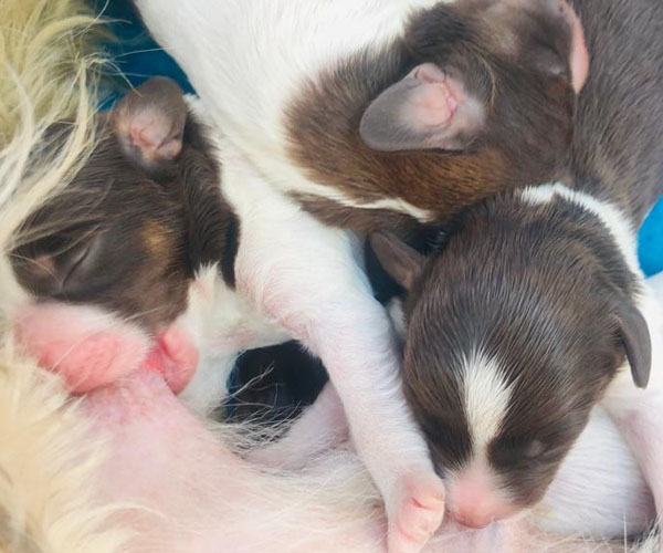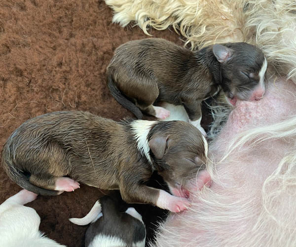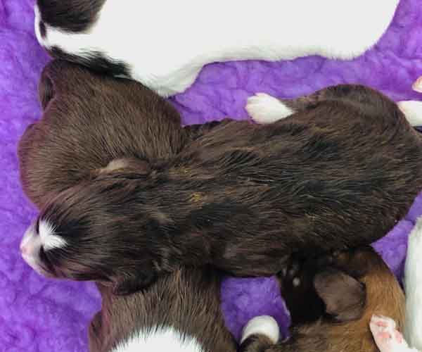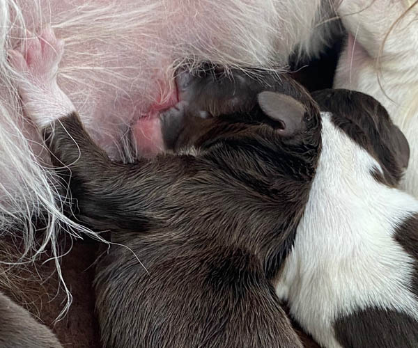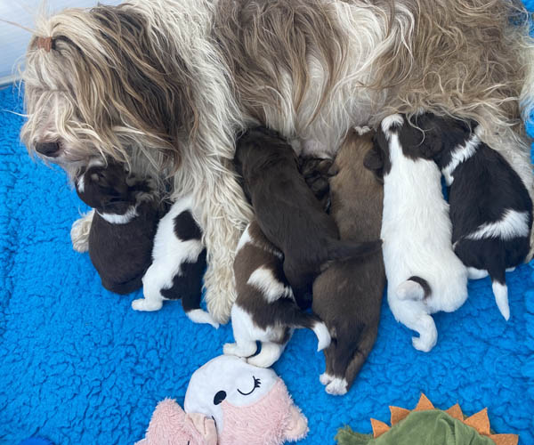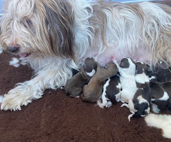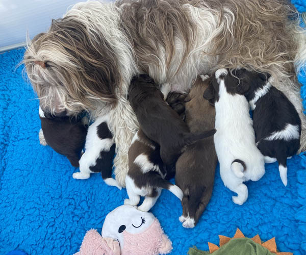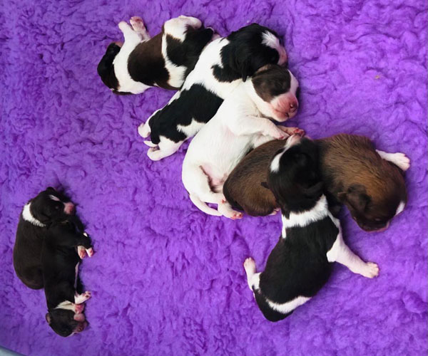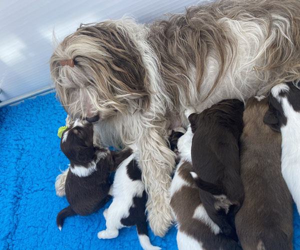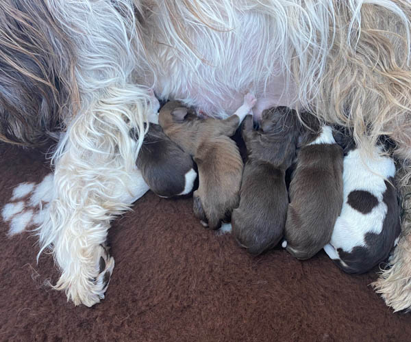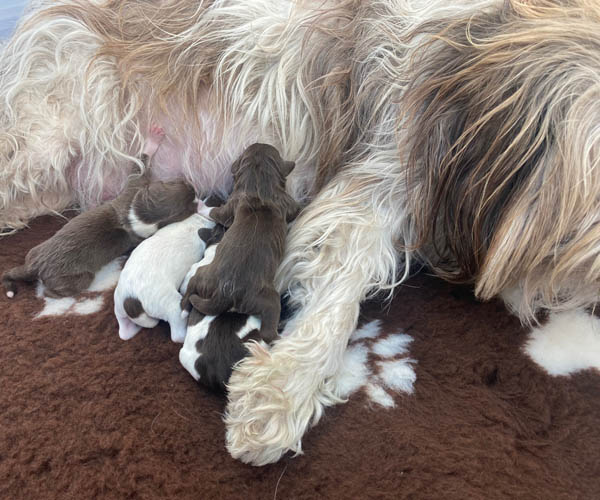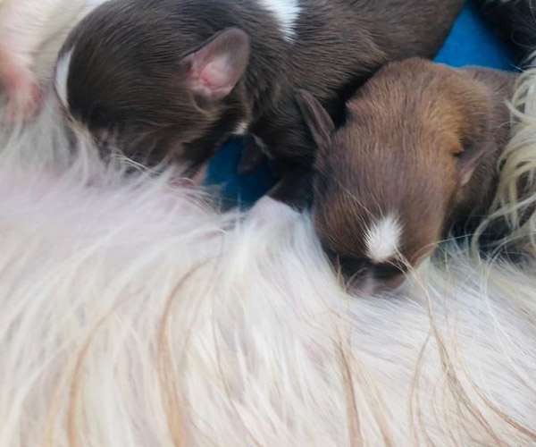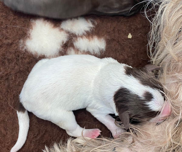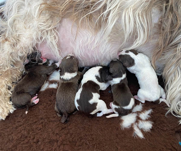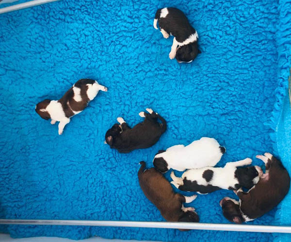 7 prachtige bruin/witte puppen met lange staart.5 reutjes en 2 teefjes en zo bijzonder mooi! De puppen zijn erg levendig en drinken erg goed en mama Coco maakt het ook goed