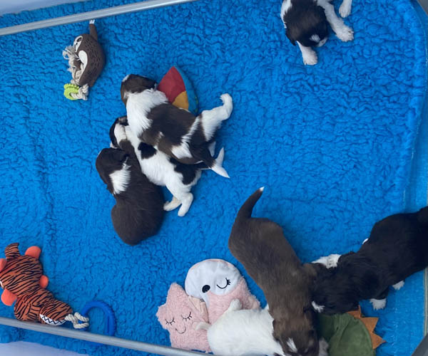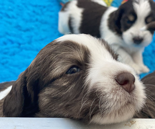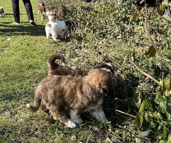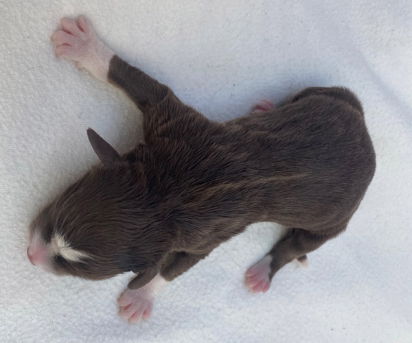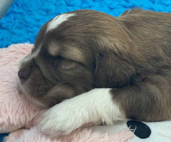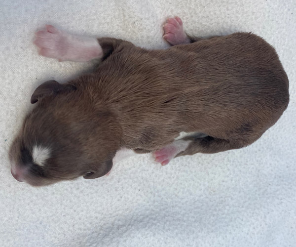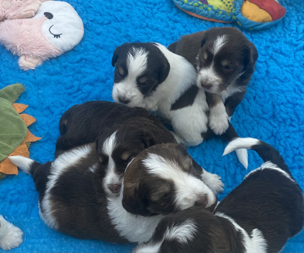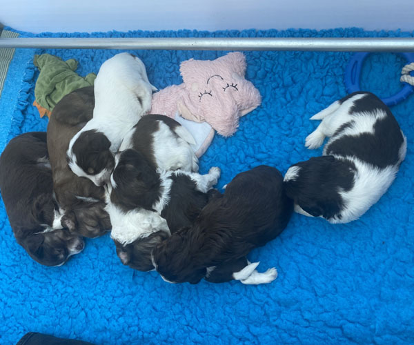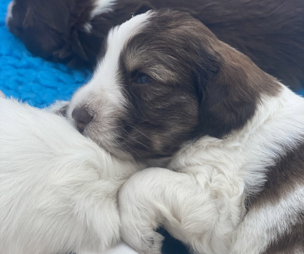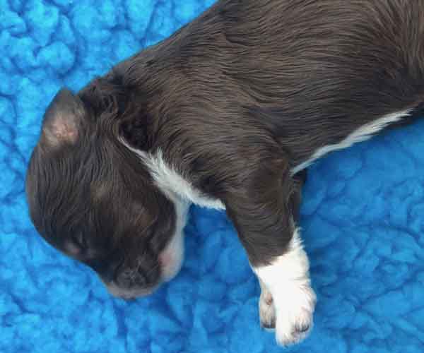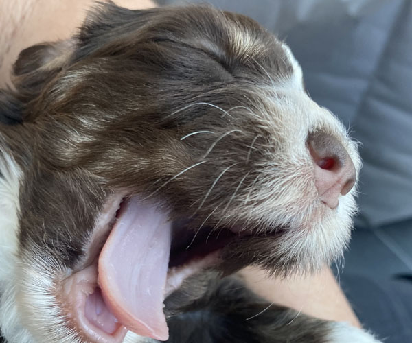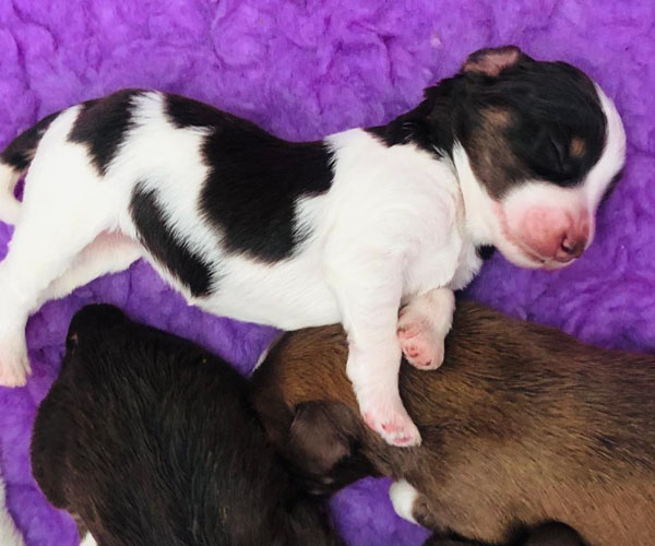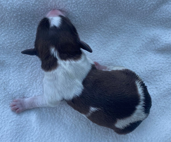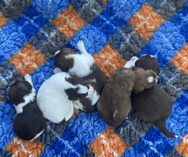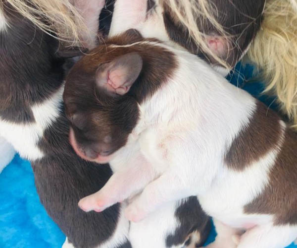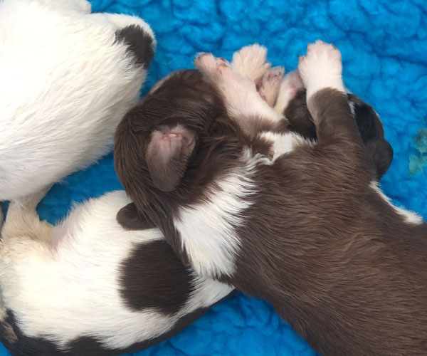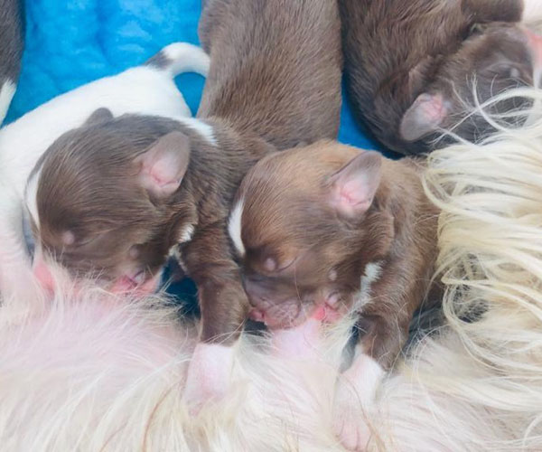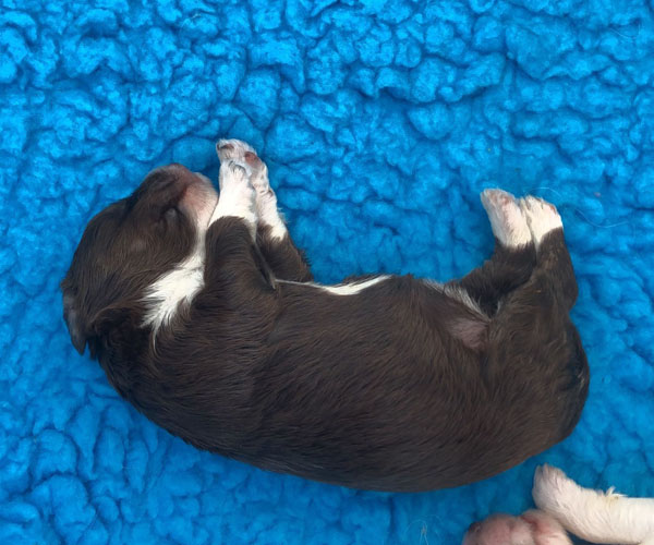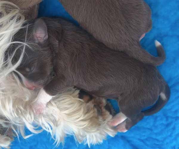 7 prachtige bruin/witte puppen met lange staart.5 reutjes en 2 teefjes en zo bijzonder mooi! De puppen zijn erg levendig en drinken erg goed en mama Coco maakt het ook goed