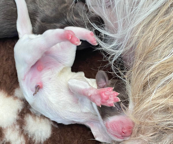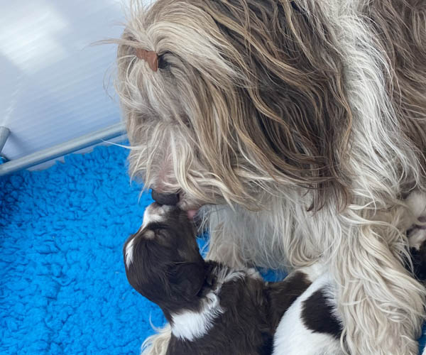 Dinsdag 17 januari: Coco heeft alles op haar eigen tijd gedaan net als haar vorige nestje. Vanaf Vrijdag gaf ze al tekenen van een aanstaande bevalling maar ze bouwde voldoende rustpauzes in voor zichzelf. Dan was ze weer gewoon zichzelf. Wij hebben ons geduld moeten bewaren. Gelukkig heeft ze verder een hele voorspoedige en relaxte bevalling gehad. Haar eerste 4 puppen werken op haar favoriete witte bank geboren. Daarna werd het toch echt tijd om Coco en haar eerste 4 puppen naar de werpkist te verhuizen.Tot dan toe wiepr ze de puppen vrij vlot achter elkaar. Vanaf pup 5 nam ze meer haar tijd. Haar eerste pup werd om 9.15 uur geboren en pup nummer 7 kwam om 15.30 uur. Coco bleef heel relaxed. Wat een prachtig nest en wat zijn we weer dankbaar!
