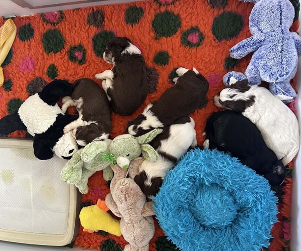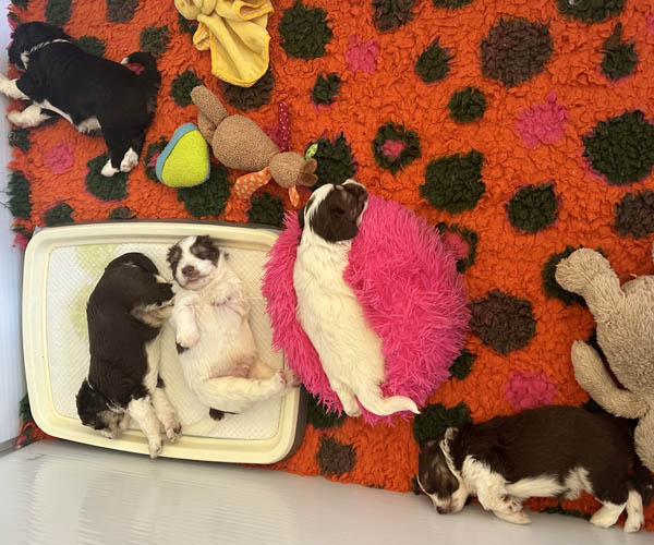 Donderdag 18 april: Het is eigenlijk gewoon niet te doen zo schattig als ze zijn! Dagelijks veranderen ze gewoon! Ze gebruiken het puppytoilet echt al heel regelmatig en ze ontdekken alles wat nieuw is en elkaar! Mama Lis is zo bijzonder liefdevol en zorgzaam. Na het voeden blijft ze nog heel erg lang bij de puppen liggen spelen en likken en liefkozen. Wat een feest! De puppen kunnen zich geen betere start wensen!