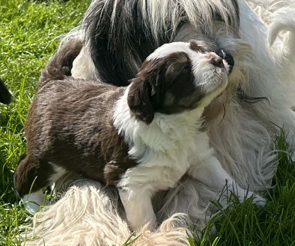Dinsdag 9 april: De puppen hebben hun oogjes geopend een aantal dagen geleden en ze kijken met een nieuwsgierige blik de wereld in..... Hulpmama Nanu en Overgrootmama Kaitlyn zijn ook erg liefdevol naar de puppen toe..