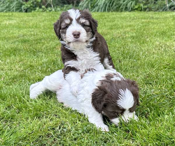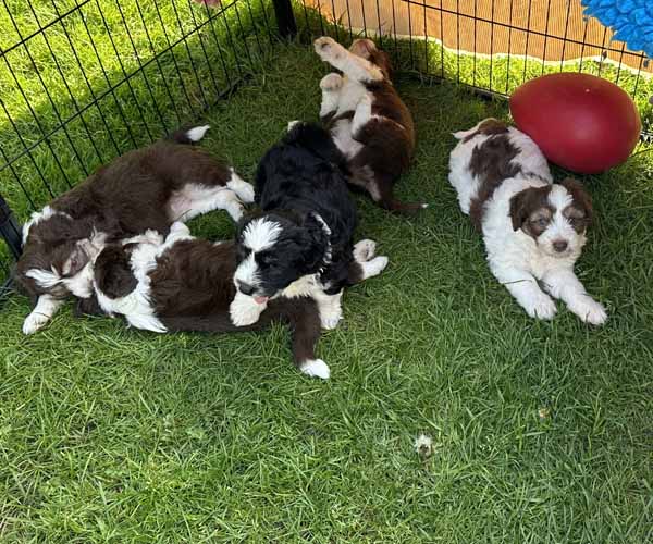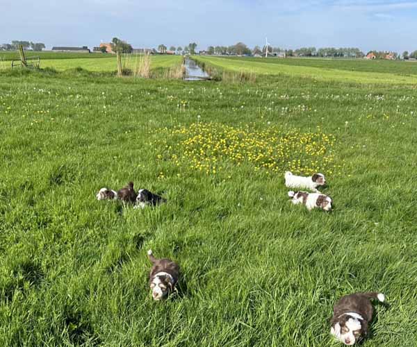 Zaterdag 4 mei: Ja wat kan ik zeggen? We hebben gewoon enorm veel plezier en lol met elkaar! De hondjes en de puppen en de mensen we genieten volop. Ze zijn nu 5 weken jong. De puppen beleven veel avonturen. Dagelijks een (kleine) nieuwe uitdaging. Het spelen in de tuin vinden ze geweldig. Ze zijn op veel verschillende plekken in verschillende benches gewend. Autoritten vinden ze al heel normaal. Ze krijgen op verschillende plekken hun eten. Zo worden het fijne flexibele en stabiele puppen. En ze gaan ook al mee wandelen met de 5 meiden om ook even lekker uit te razen in de grote weide.