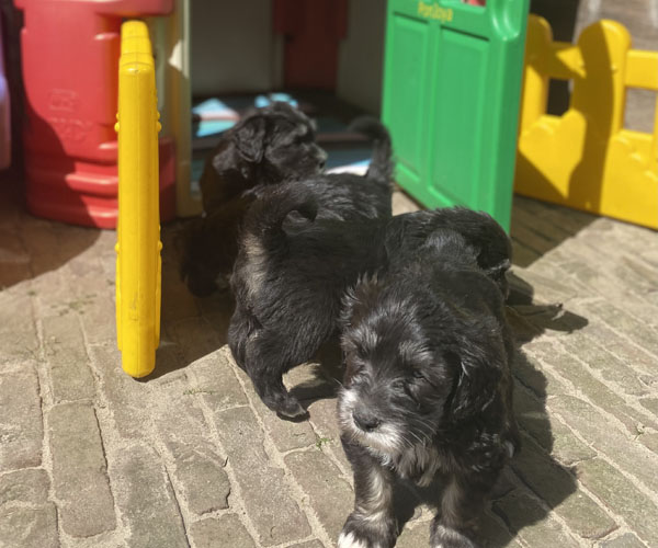 Ze hebben in hun eigen puppyren inmiddels ook een schommel en een draadbench waar ze zich heerlijk veilig in voelen. Natuurlijk is hulpmama Nanu weer helemaal in haar element en de puppen vinden haar geweldig!