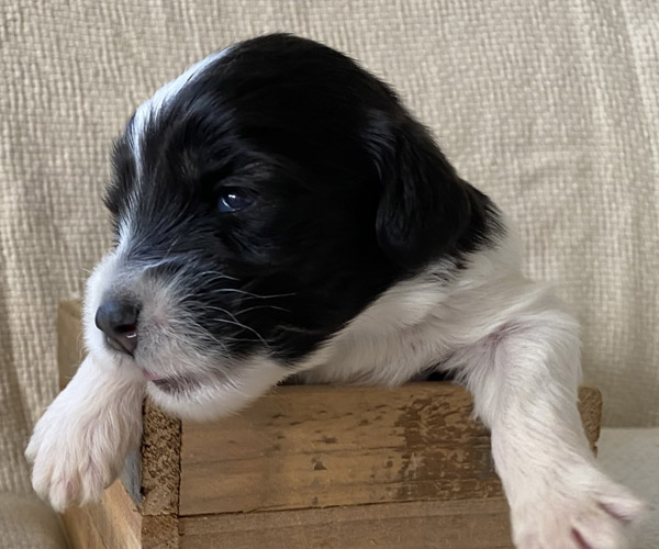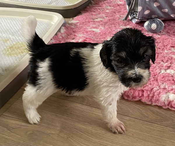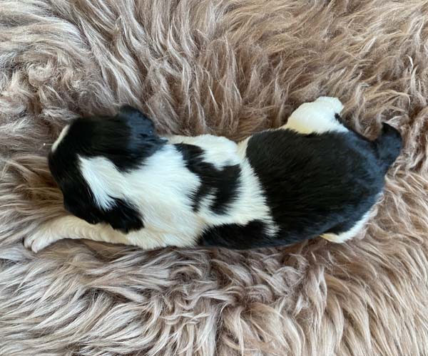 Pup 1 BELLEFLEUR Teefje zwart/wit met een lange staart. Geboortegewicht 300 gram
