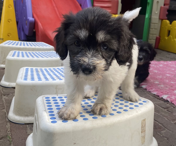 We zijn ook begonnen aan de benchtraining door een paar canvasbenches in de puppyren neer te zetten en de puppen te motiveren de benches te verkennen. We zullen de puppen met allerlei verschillende soorten en maten benches kennis laten maken zodat zij straks als ze naar hun nieuwe huisjes gaan de bench goed kennen. Dat scheelt weer veel werk straks.