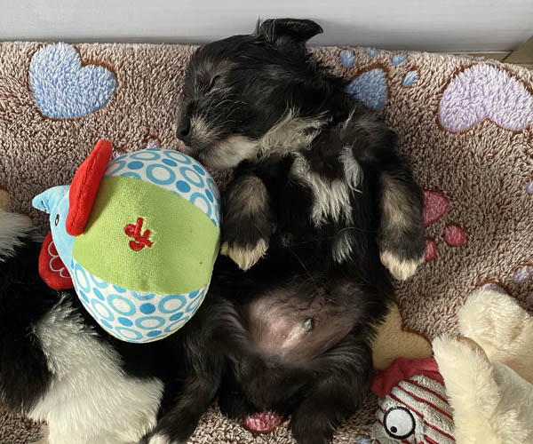 Pup 7 DESIDERATA Teefje zwart met een lange staart. Geboortegewicht 306 gram.