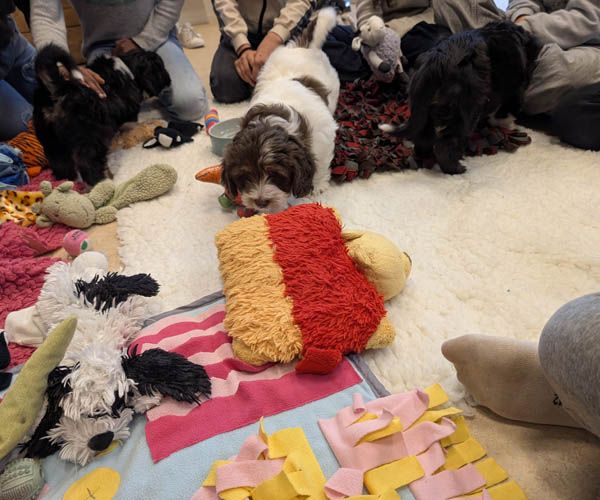 Naast het spelen krijgen de puppen volop verschillende prikkels aangeboden. Zo maken ze kennis met onder andere skeelers en skateboards, zodat ze op jonge leeftijd al leren omgaan met beweging en onverwachte geluiden. Daarnaast dragen de puppen regelmatig verschillende kledingstukken. Dit helpt hen te wennen aan het dragen van kleding of een body, wat later van pas kan komen; bijvoorbeeld wanneer ze worden ingezet als therapiehond of als er om medische redenen ondersteuning nodig is.